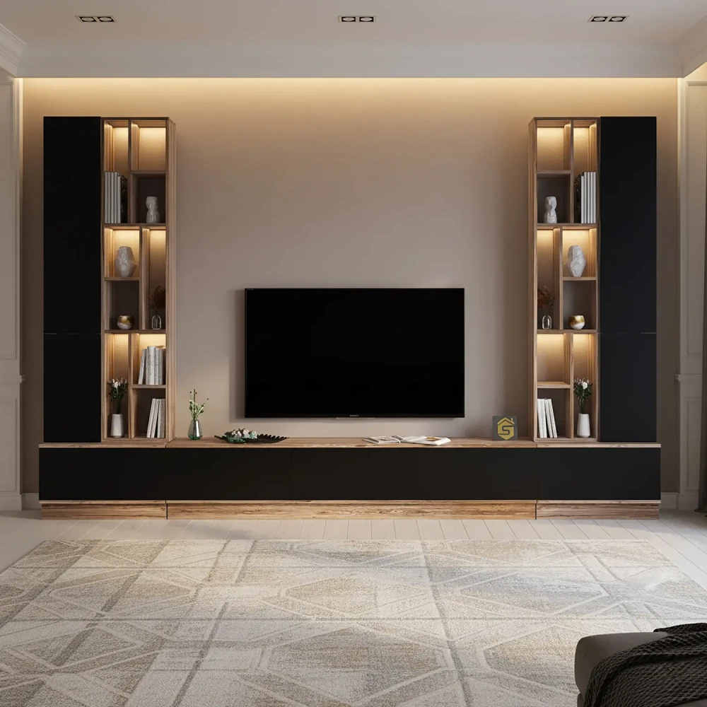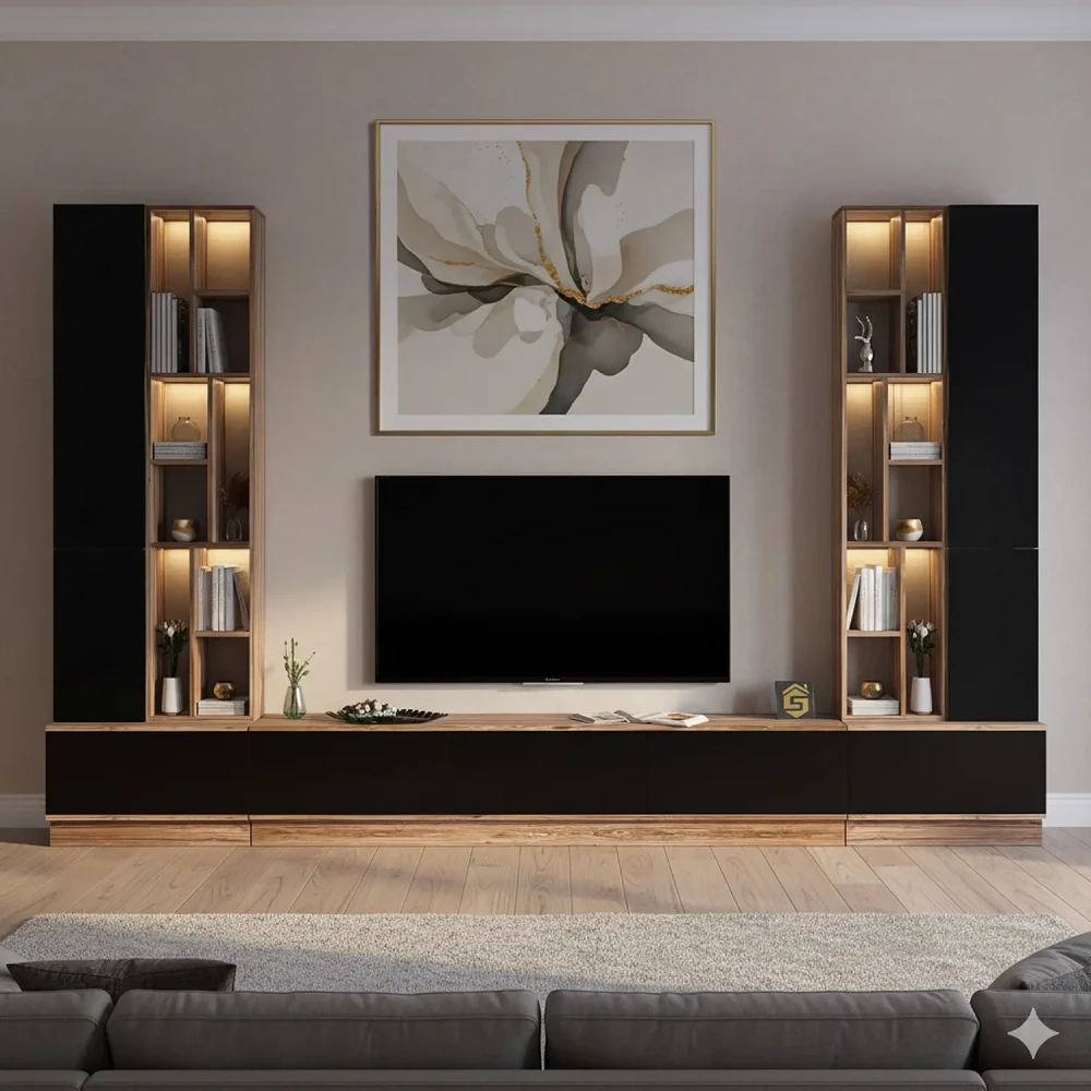 طاولة بلازما مودرن أسود مع بني، تعتبر هذه الطاولة واحدة ضمن مجموعة طاولات تلفزيون بلازما تصميم تركي مميز وصناعة سعودية، تم تصنيعها بعناية داخل السعودية، وتم استخدام أجود انواع الخشب التيلندى الذي يتم استخدامه في تصنيع طاولات تلفزيون مميزة وعالية الجودة.
