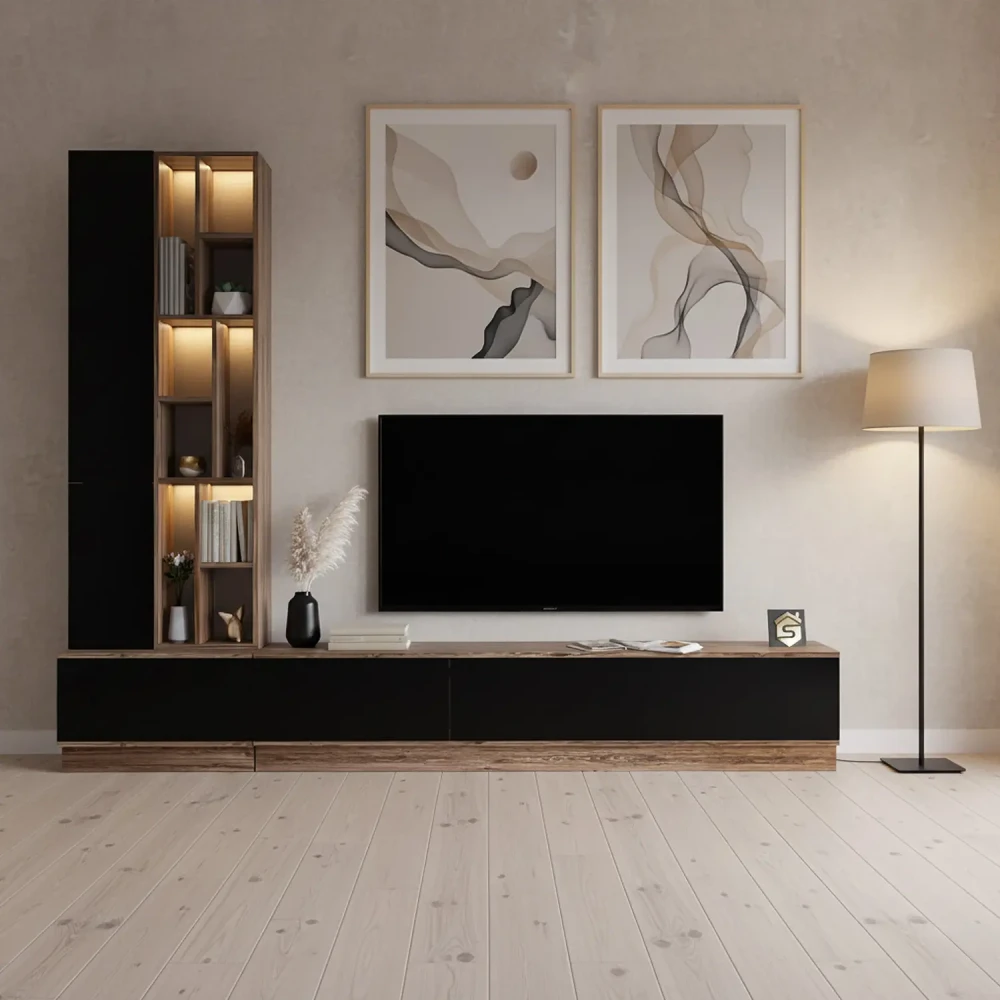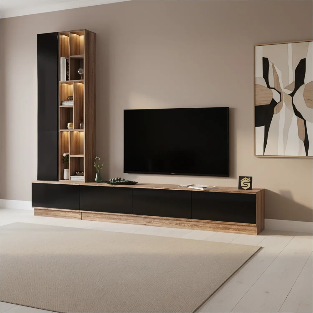 طاولة بلازما مودرن أسود مع بني شاملة الاضاءة بدون سلك، تتكون الطاولة من ثلاثة درف وعرضها 210 سم مما يجعلها تستوعب شاشة أكبر من 75 بوصة، وجزء جانبي متحرك بعرض 70 سم يحتوي على أرفف ودرف، ويمكن وضع الانتيكات او التحف.
