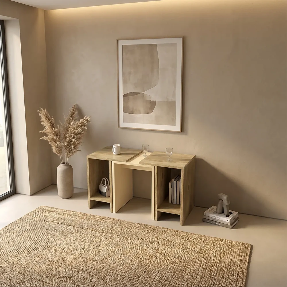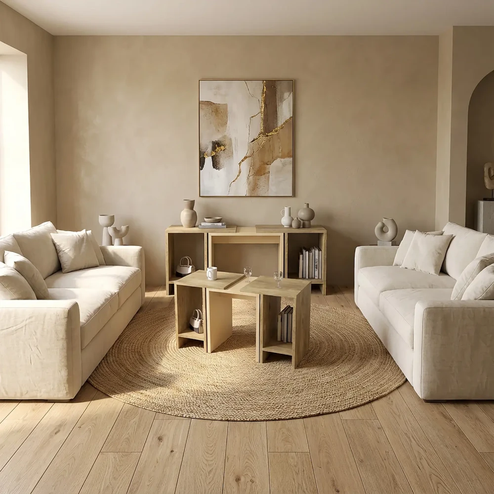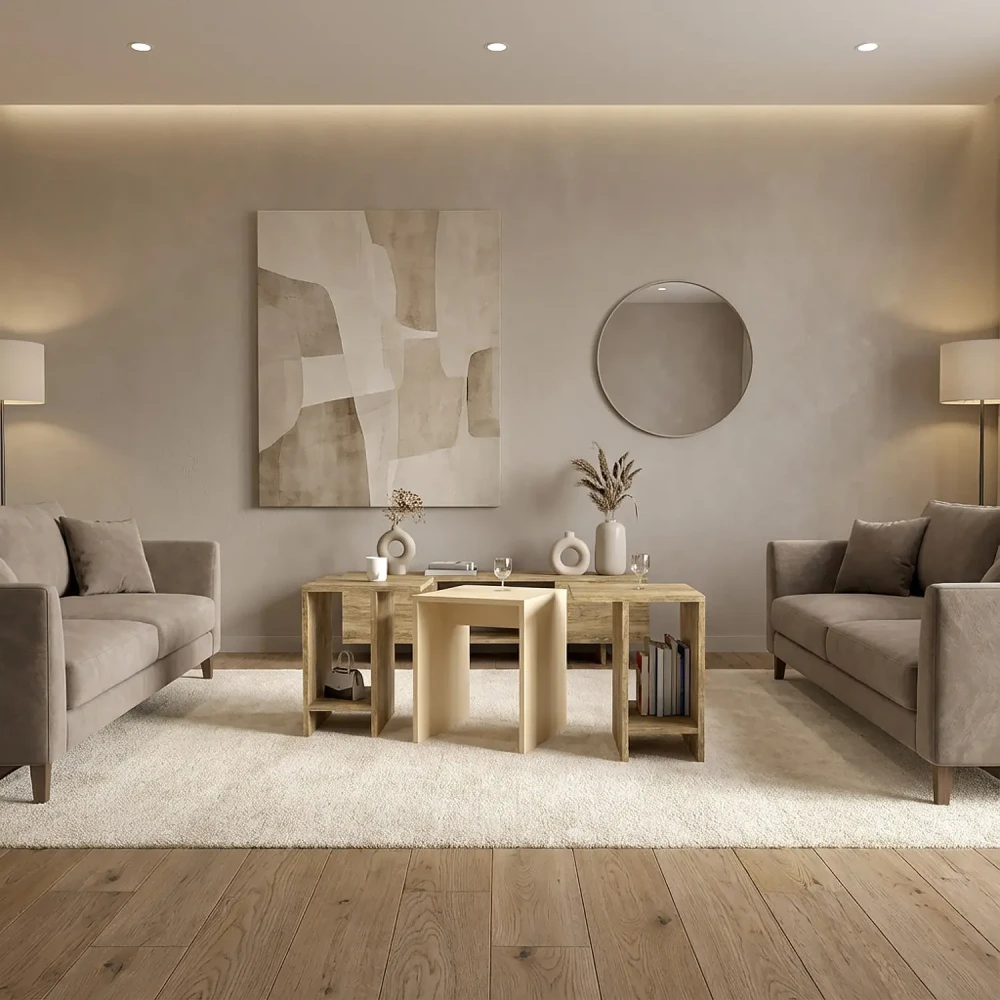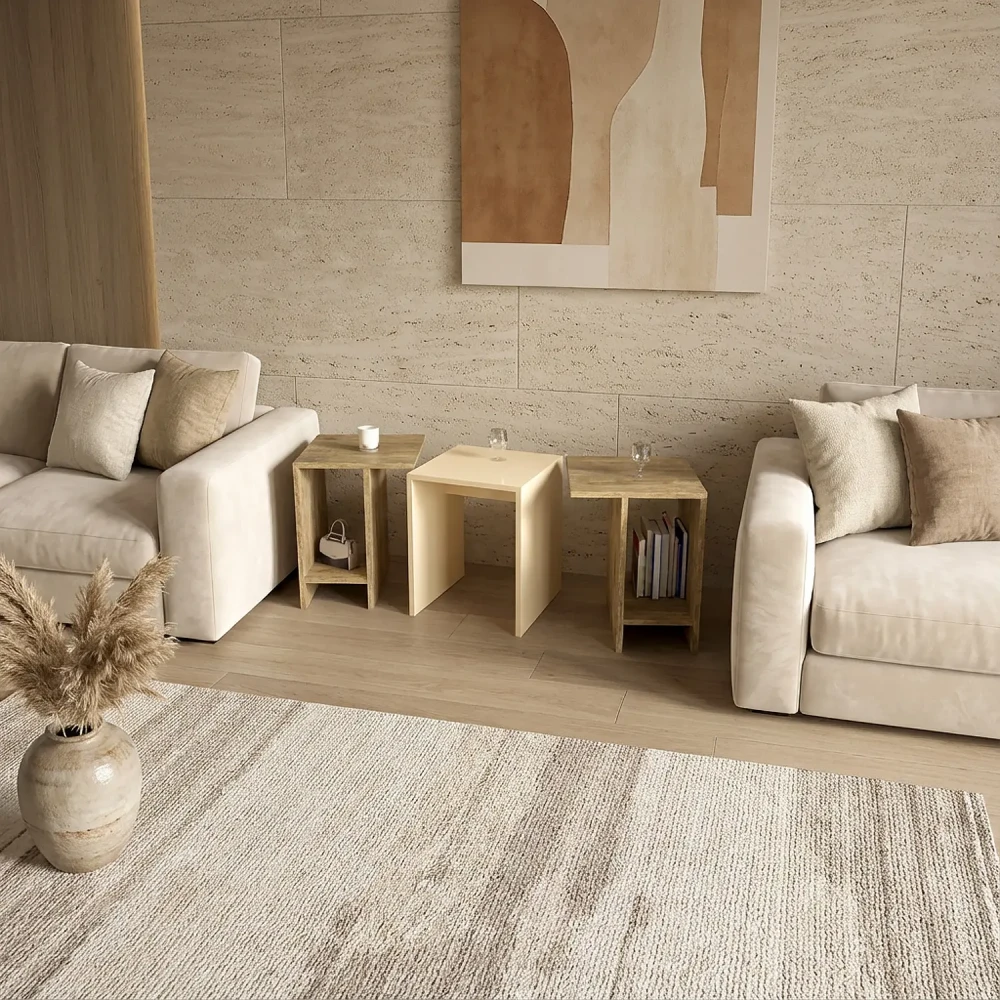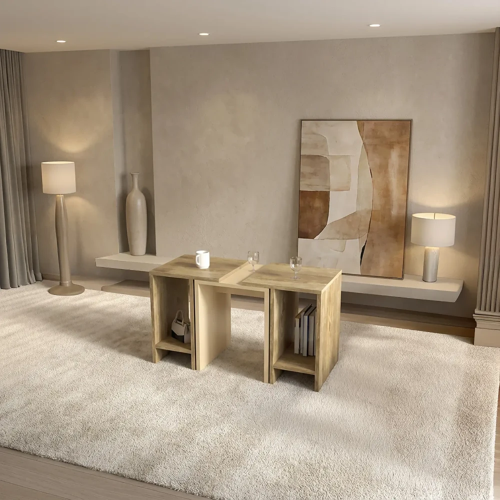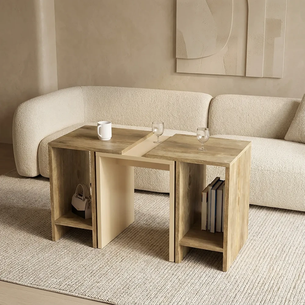 طاولة قهوه حديثة لونين، يمكن استخدامهم أكثر من استخدام، فهى قابلة للتقسيم الى ثلاث اجزاء، يمكن تجميع الطاولتين ذات اللون الخشبي مع الطاولة الوسطي بشكل منسق، وتم التصميم باللونين ألبيج واللون الخشبي.
