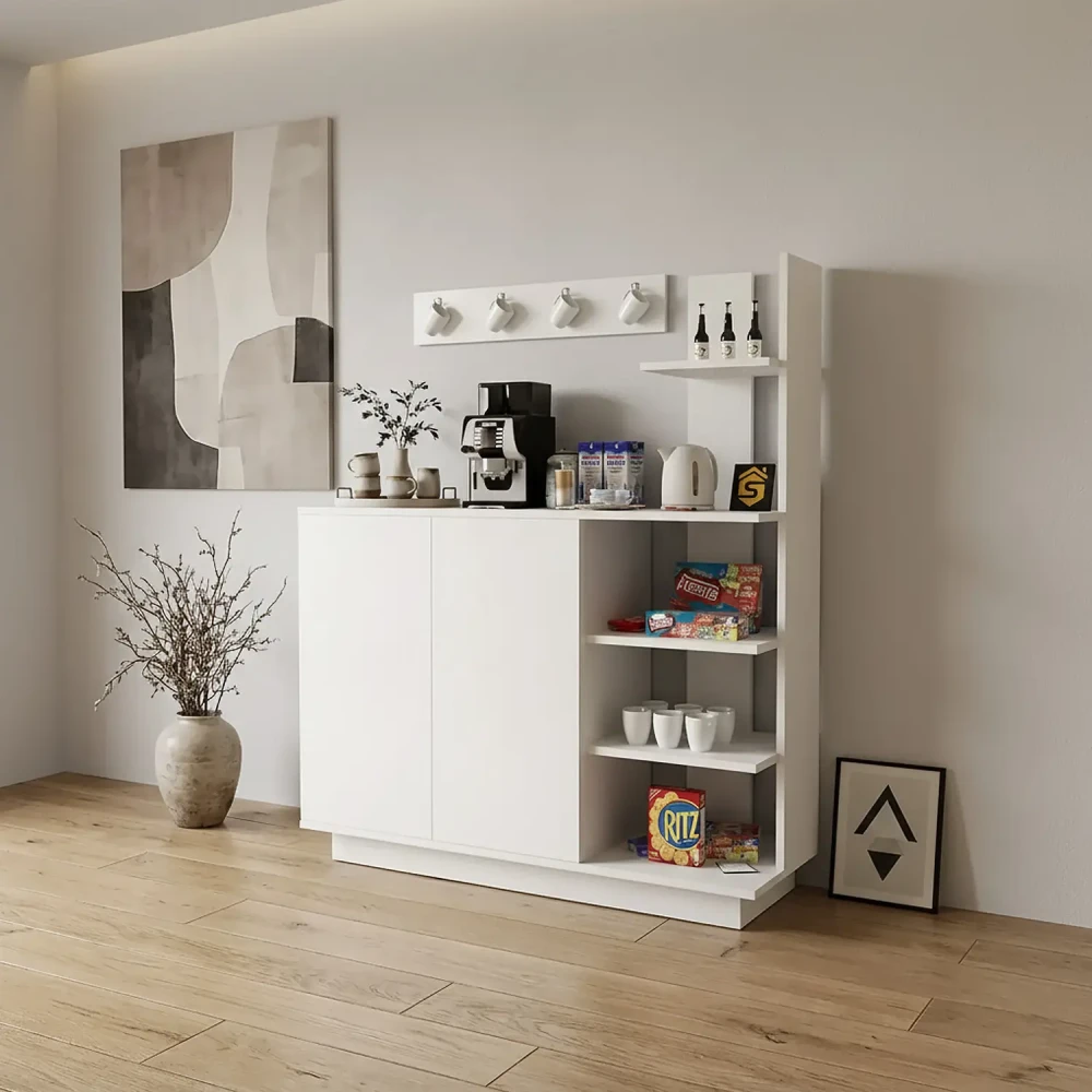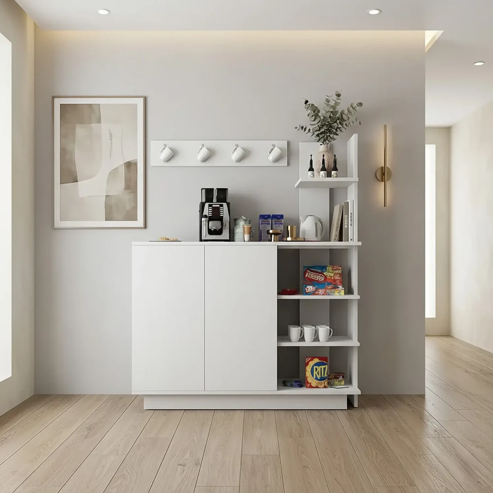 ركن قهوة برفوف لون أبيض، صمم الركن بطريقه عمليه، للاستخدام العملي، فهو يحتوي على درفتان على الجانب الايسر، وأربع أرفف مفتوحه على الجانب الايمن، ويمكن استخدام سطح الركن وعرضه حوالي 120 سم لوضع ماكينه تحضير القهوه، او تحضير المشروبات، بالاضافة الى حامل للمجات يمكن تعليقه اعلى الركن.