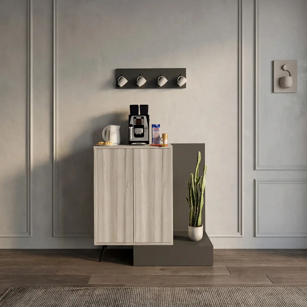 ركن قهوة تصميم تركي رمادي درجتين، يحتوي على درفتان وجزء جانبي يمكن وضع فازة او اشجار الزينة عليها، ويمكن استخدام اعلى ركن القهوه كرف لوضع الاغراض بعرض 90 سم، بالاضافه الى وحدة تعلق على الجدار حامل للمجات، والركن مصنع من الخشب التلندي المغلف بطبقة من الميلامين المقاوم.