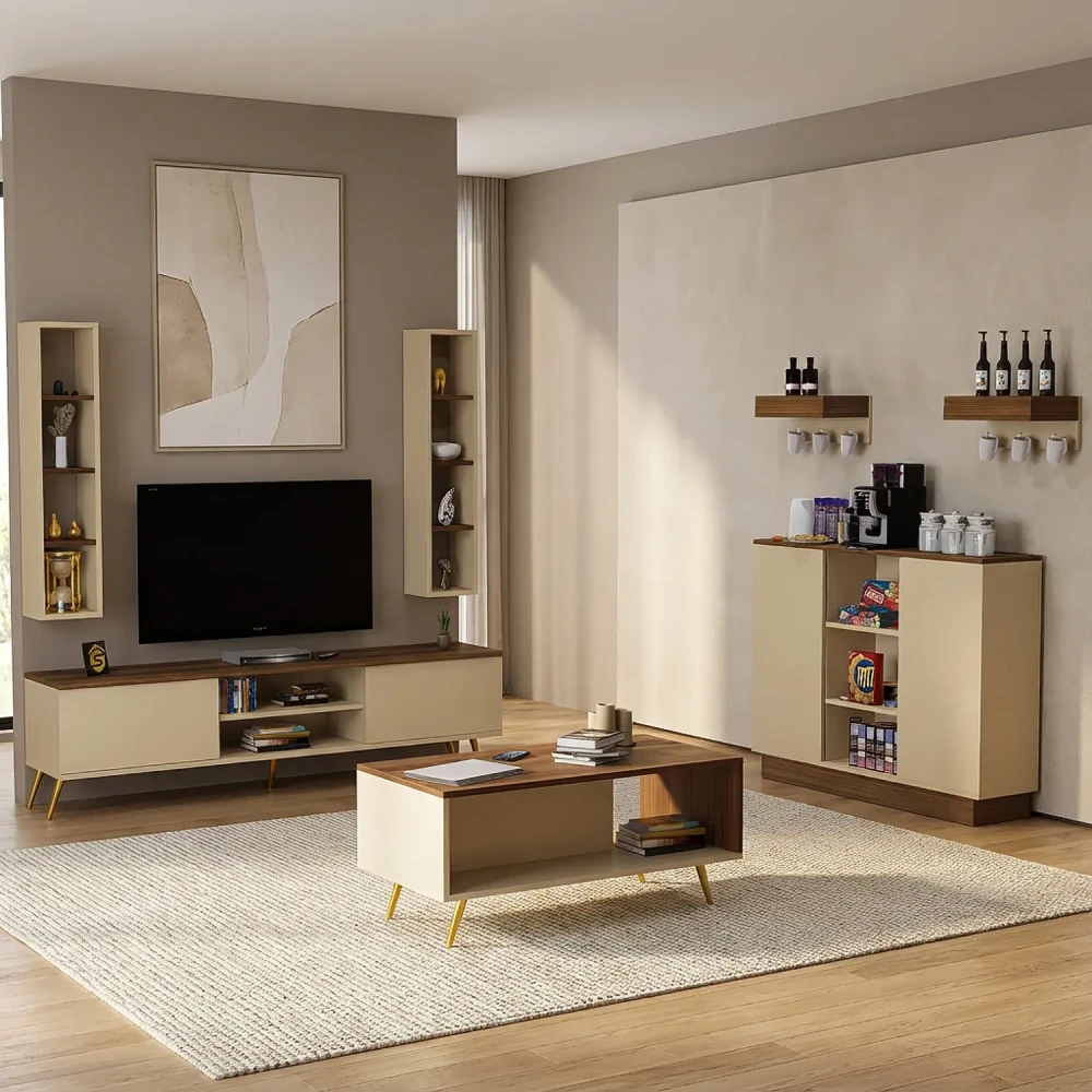 ركن قهوة لون بيج مع بني، تم تصميم هذا الركن ليكون ذو استخدام عملي، فهو يحتوي على درفتان على الاجناب بداخلهم رف، وثلاثه ارفف مفتوحه فى المنتصف، ويمكن استخدام اعلى ركن القهوه كرف لوضع الاغراض بعرض 120 سم، بالاضافه الى رفين يمكن تعليقهم على الجدار بحامل للمجات، وتم التصميم باللون البيج مع اللون البني.