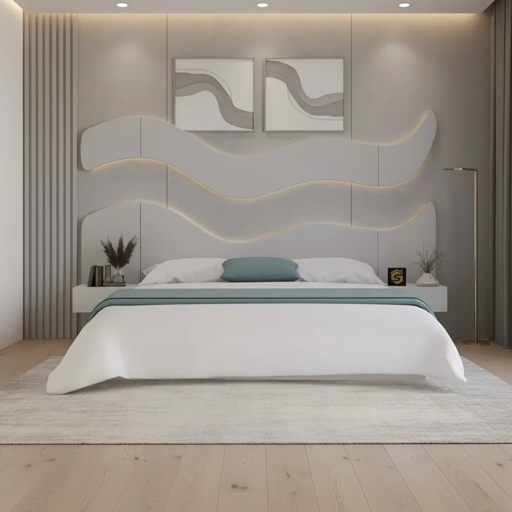 سرير مودرن 200×200 مع ديكور جداري وكومدينتين لون ابيض