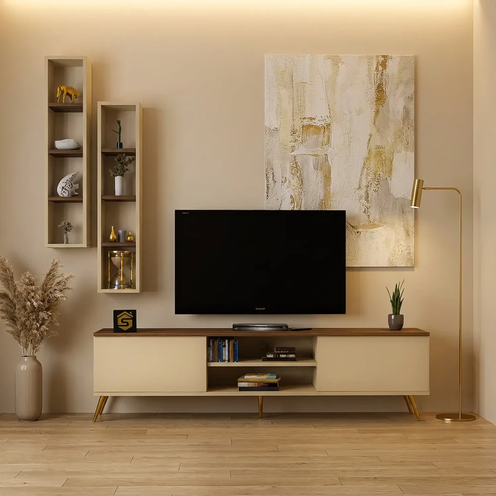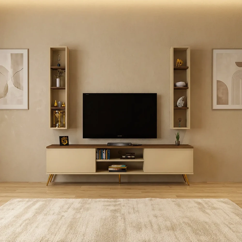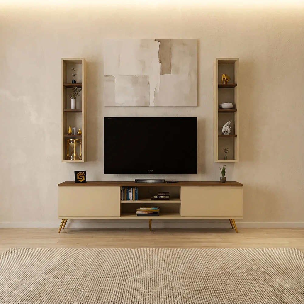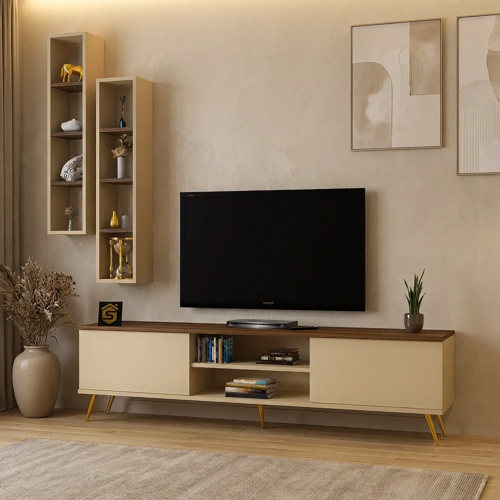 طاولة تلفاز لون بيج مع بني و وحدتين أرفف، تم تصميم هذه الطاوله بطابع تركى حديث، وتتكون طاوله التلفزيون من درفتين كبيرتين على الجانبين، ورفين مفتوحين فى المنتصف، لوضع التحف او الكتب فيه، متعدده الاستخدام، ويمكن وضع اجهزه التحكم عن بعد، واجهزه الالعاب أعلى الطاولة، وقطعتين على شكل مستطيل، بكل واحده أربعة ارفف، لتزيين الجدار بوضع التحف فيها، او اسخدامهم فى اغراض اخرى.