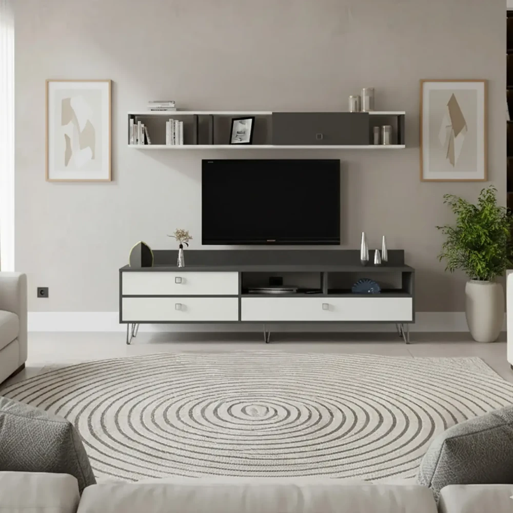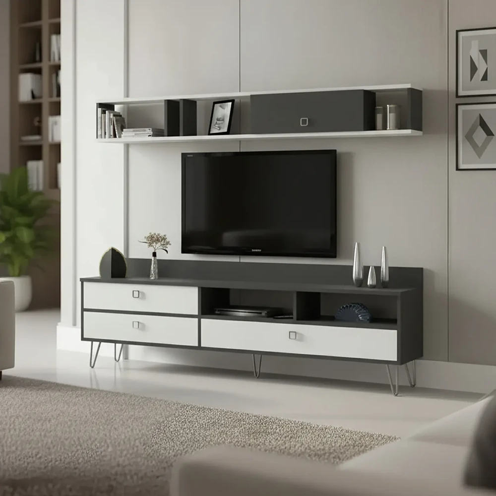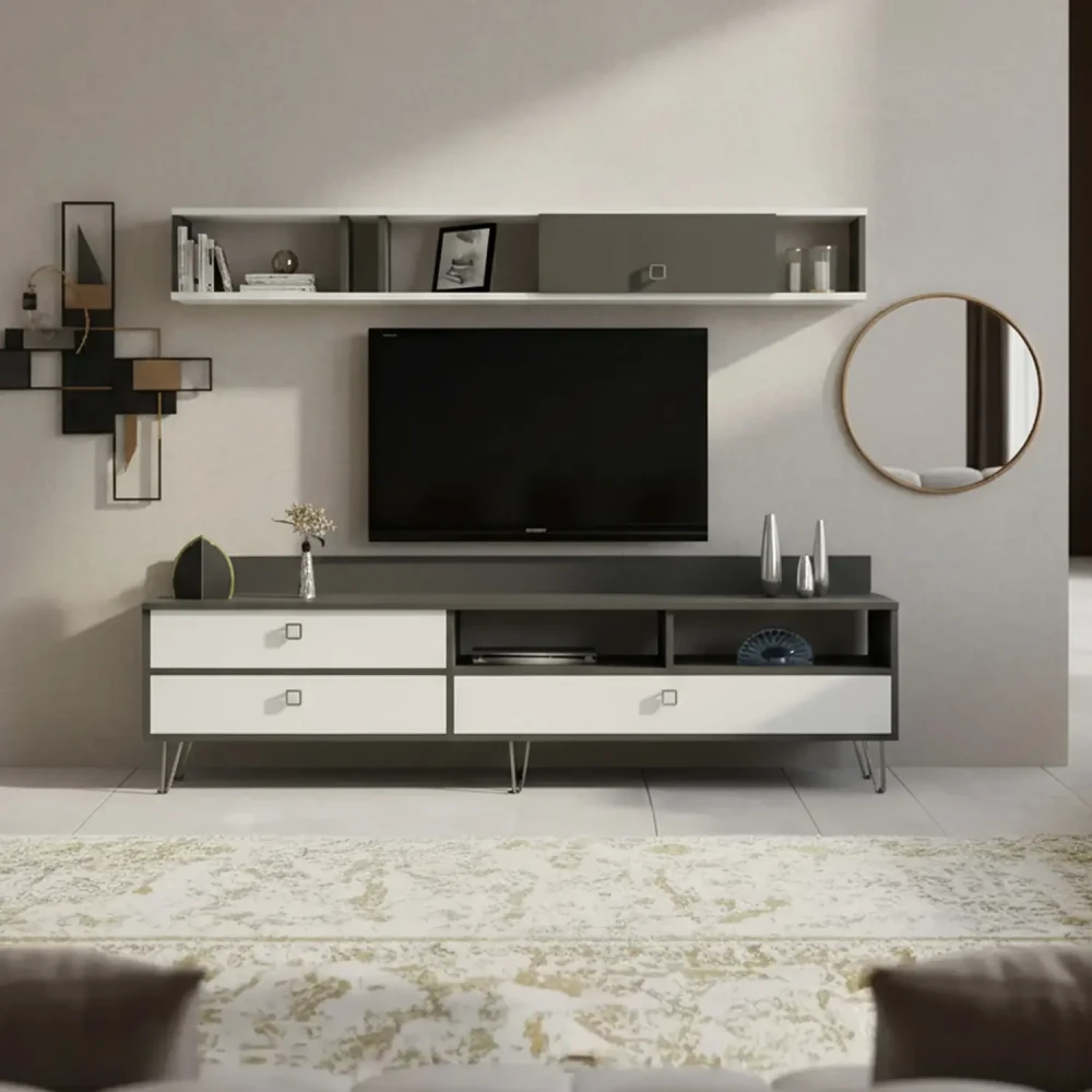 طاولة تلفزيون لون أبيض مع رمادي، صممت الطاولة باللون الابيض واللون الرمادي، وتتكون هذه الطاوله من ثلاثة درف، ورفين مفتوحين، ويمكن وضع اجهزه التحكم عن بعد بداخلها، ووحده رف تعلق اعلى الطاوله بها درفه، تم تصميم الطاولة على الذوق التركي .