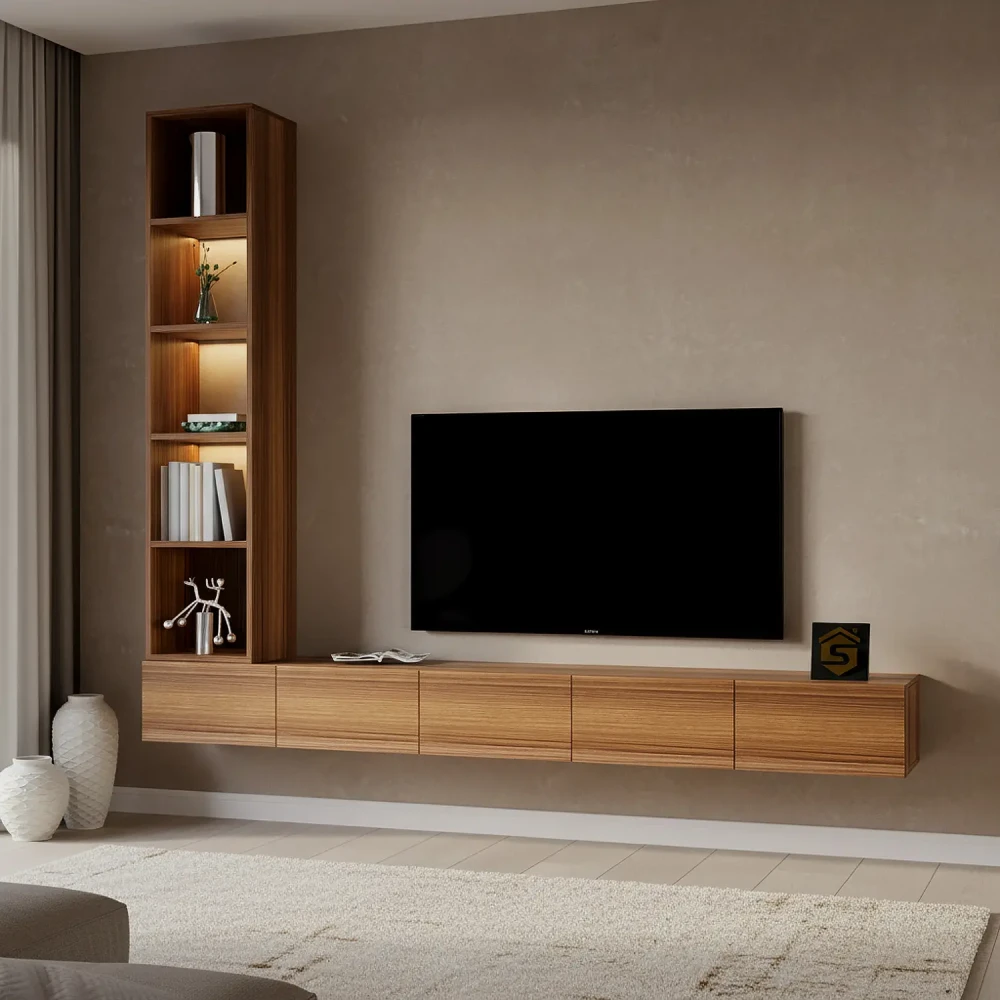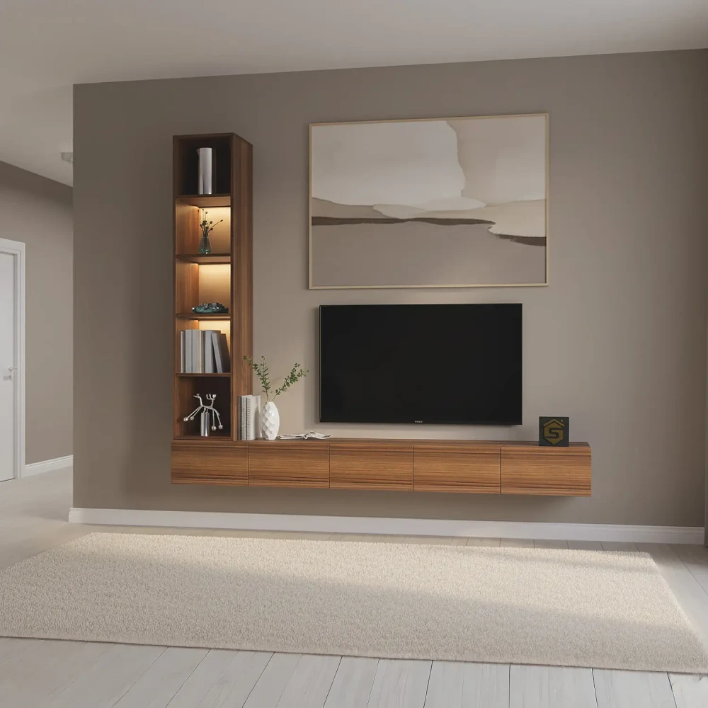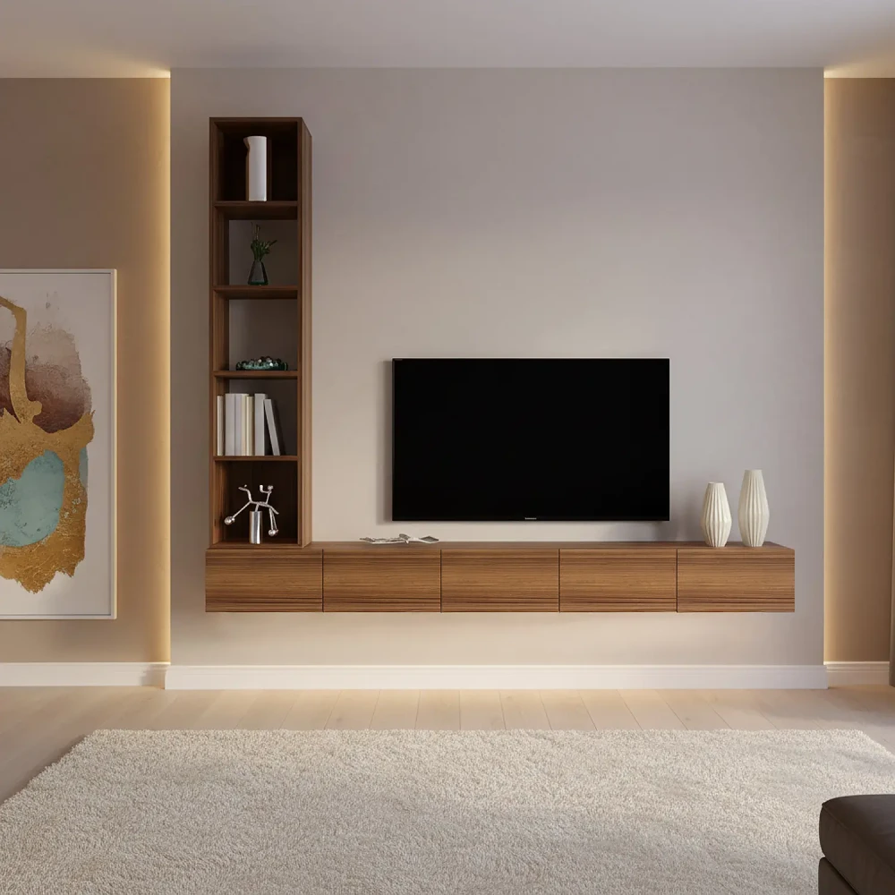 اختيار مثالي لمن يبحث عن وحدة تلفزيون جدارية بتصميم فاخر يجمع بين العملية والمظهر العصري في قطعة واحدة متكاملة.