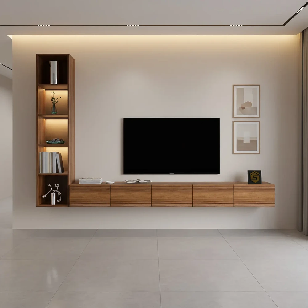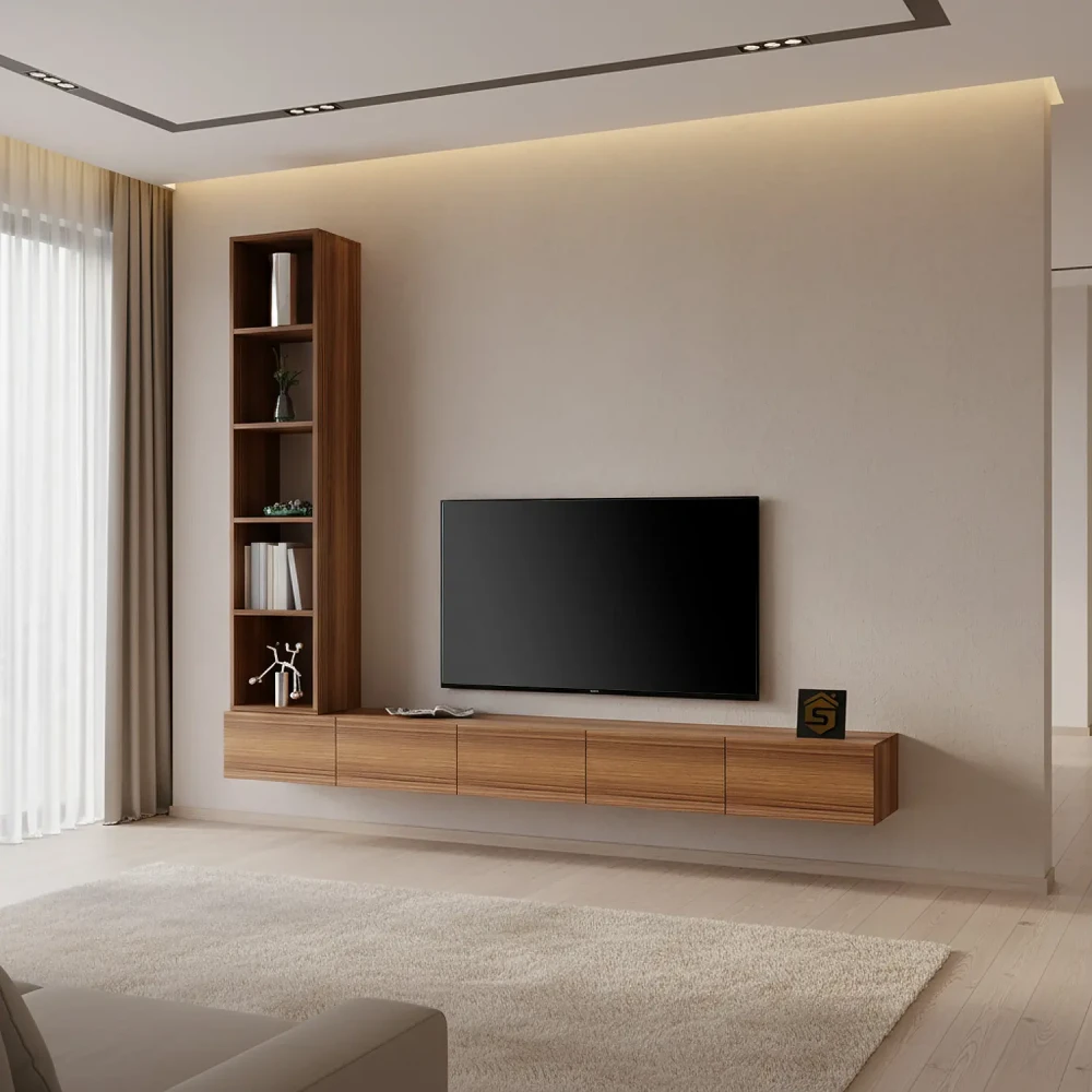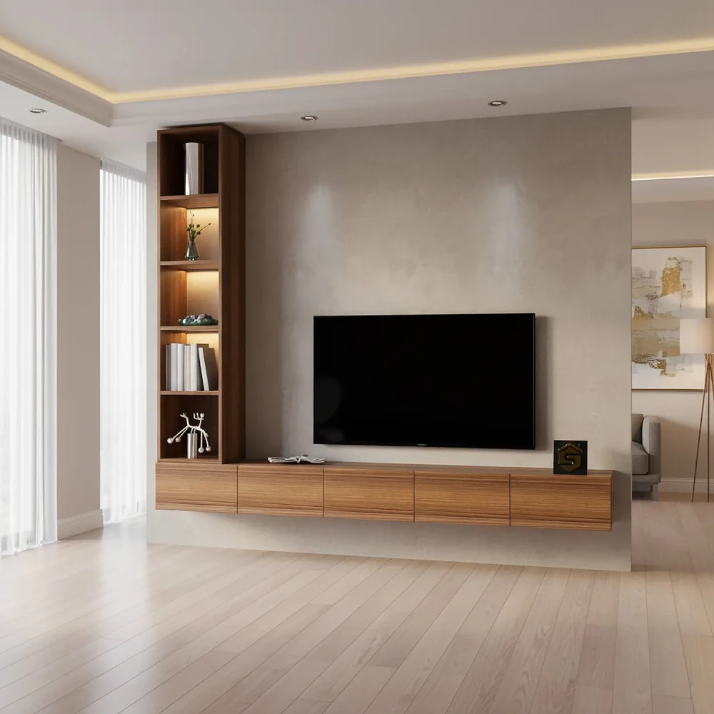 تصميم عصري يجمع بين الفخامة والتنظيم العملي، لتمنح غرفة المعيشة مظهرًا أنيقًا ومساحة أكثر ترتيبًا.