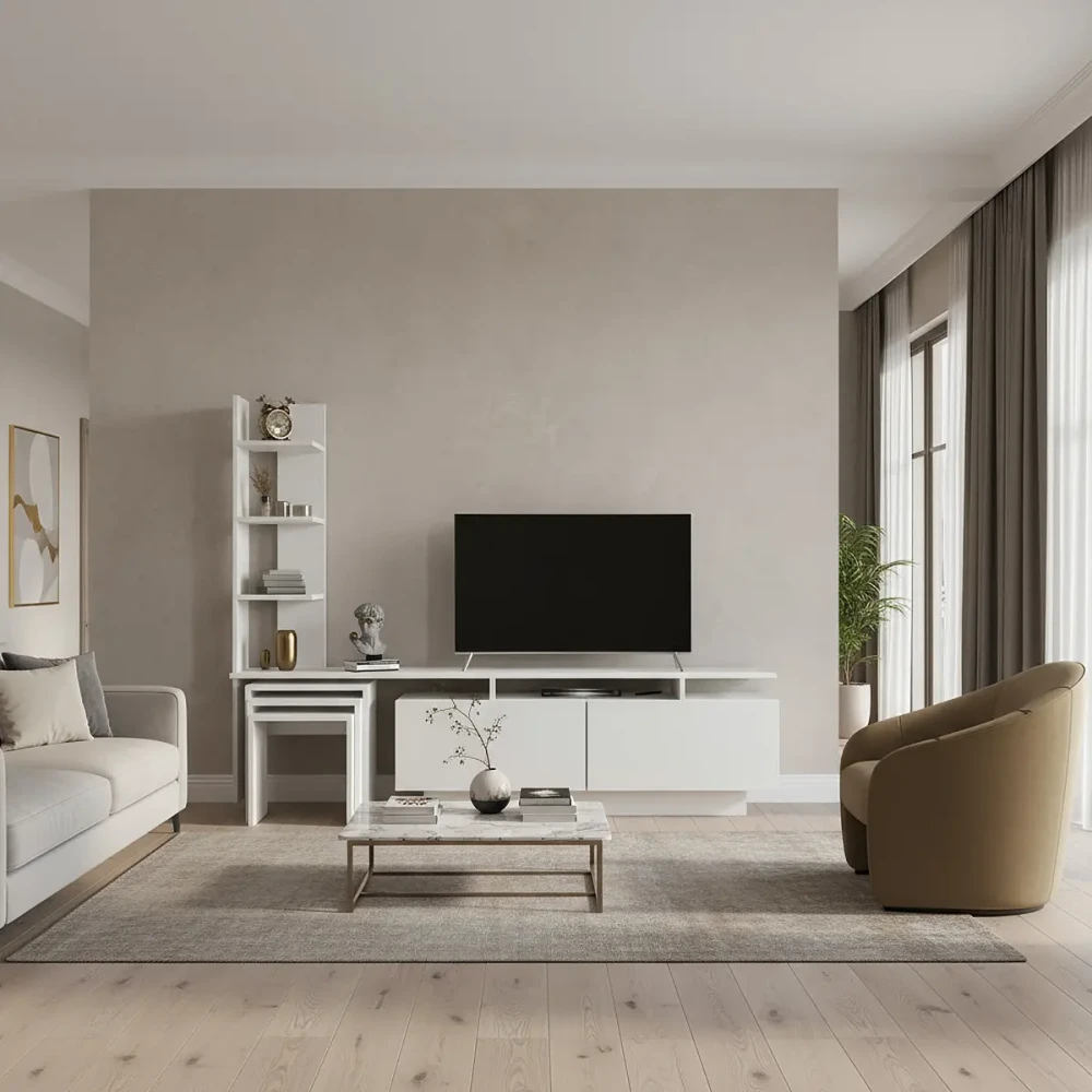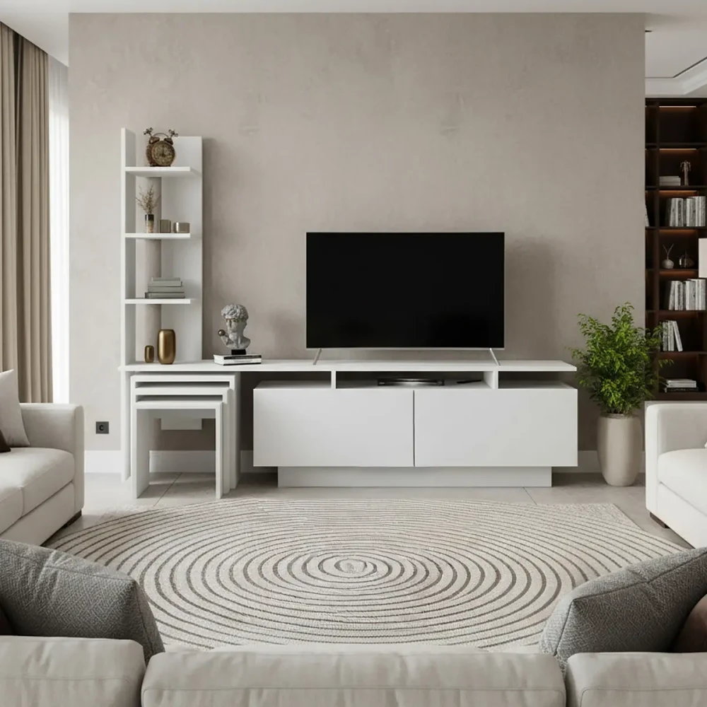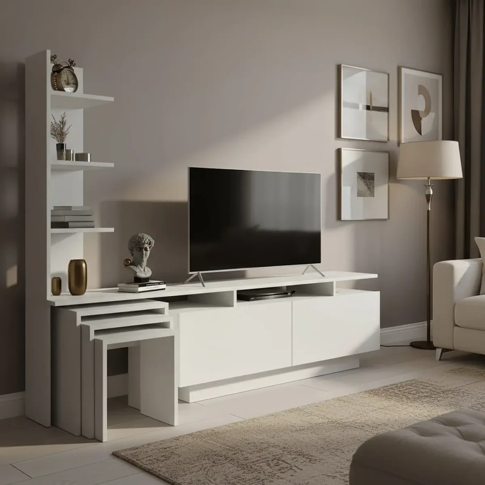 طاولة تلفزيون مع 3 طاولات خدمة، طاولة ذكية، باللون ألابيض، تتكون من درفتان، وقطعة أعلاهم تشكل رف منخفض الارتفاع، مناسب لوضع أجهزة التحكم عن بعد، وأرفف جانبية تميز التصميم بلمسة جديدة، بالاضافة الي 3 طاولات خدمة، يتم تخزينهم اسفل الطاولة ،