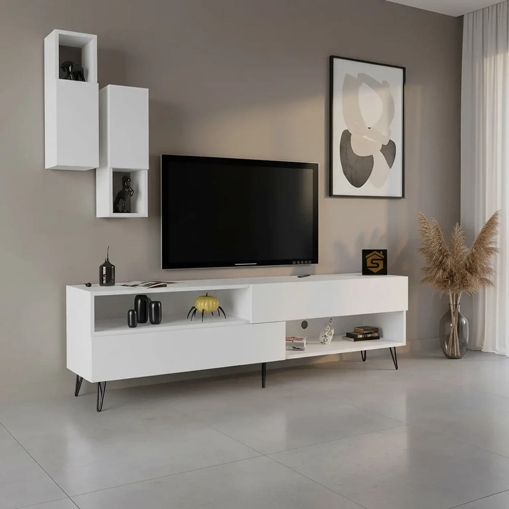 وتحتوي أيضاً على قطعتين معلقتين، عبارة عن أرفف ولها درف من الأعلى ومن الأسفل بدون ضرف، ميزة هاتان القطعتان انه يمكن تعليقها في أماكن مختلفة على حسب الرغبة لتختار الأنسب مع ديكورات المنزل، وكذلك مع شاشة التلفاز ،