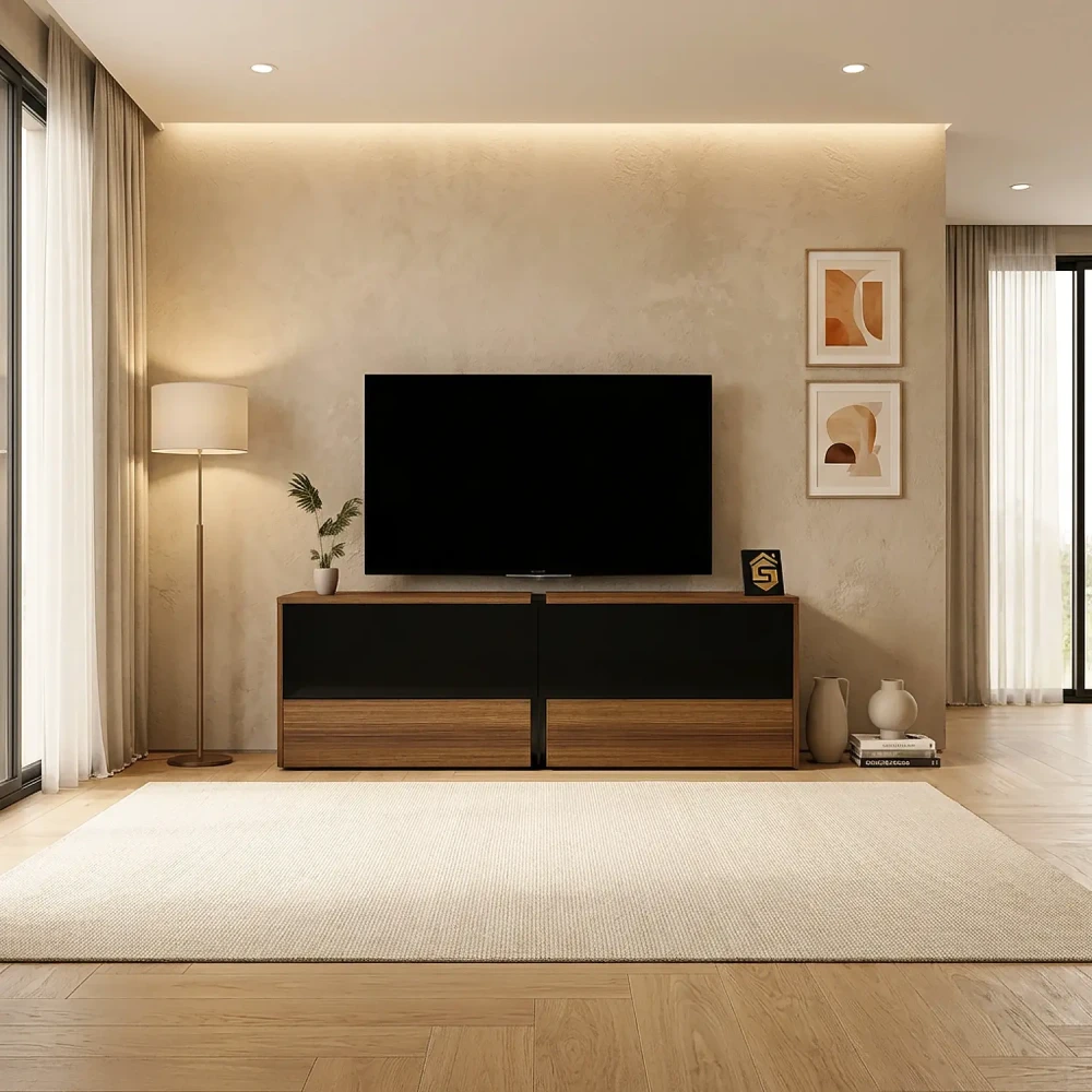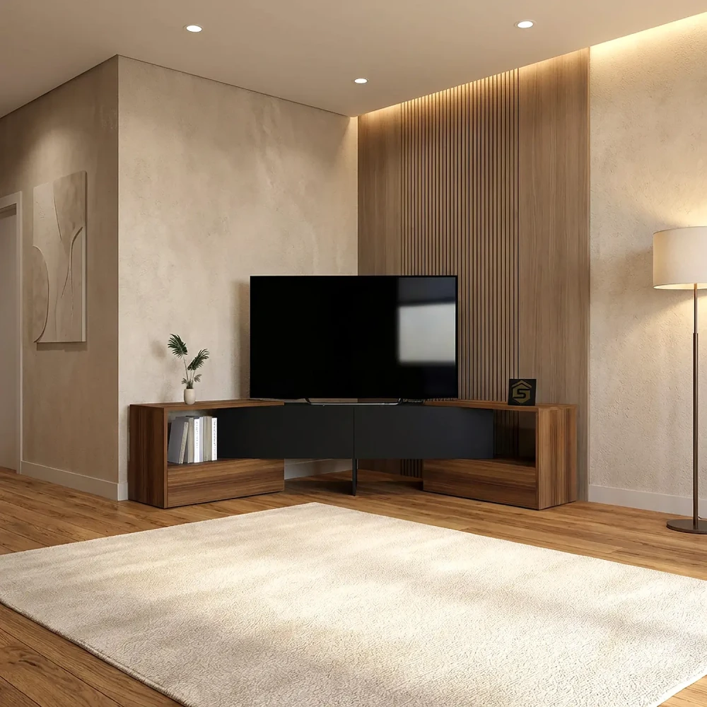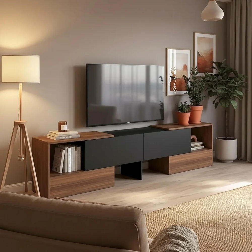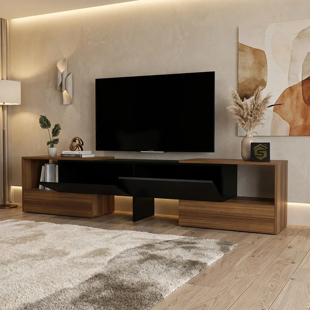 طاولة شاشة قابلة للتعديل لون بني مع اسود تعتبر واحدة ضمن مجموعة طاولات تلفزيون تصميم تركي مميز وصناعة سعودية ، تم تصنيعها بعناية داخل السعودية ، وتم استخدام أجود انواع الخشب التيلندى الذي يتم استخدامه في تصنيع طاولات تلفزيون مميزة وعالية الجودة