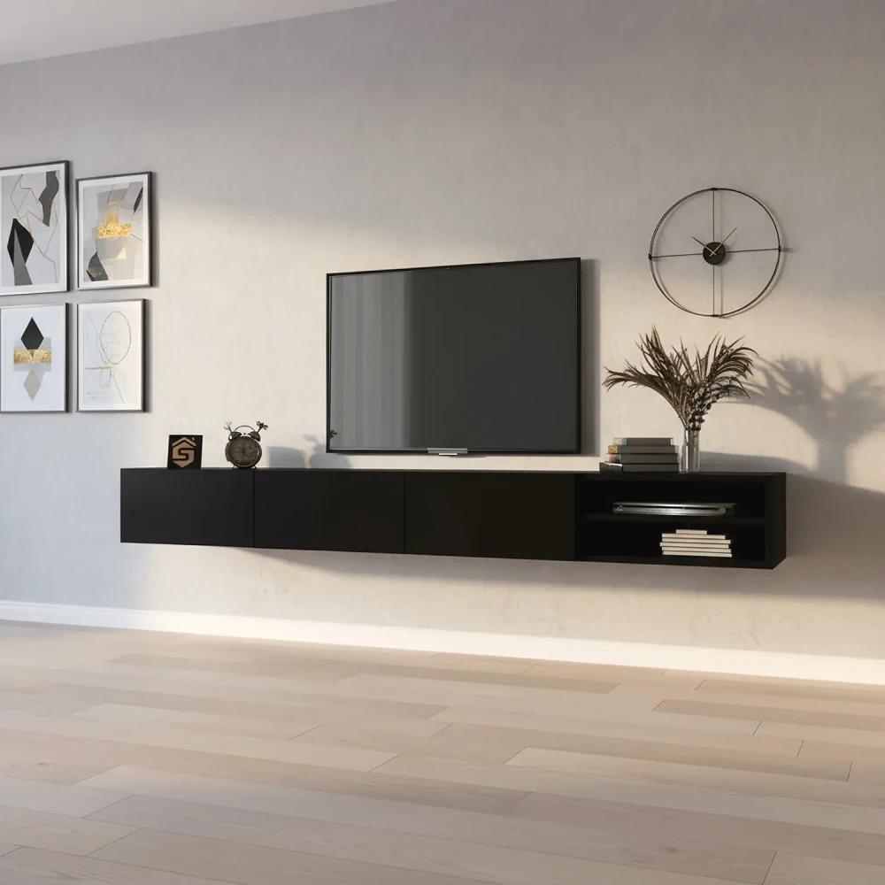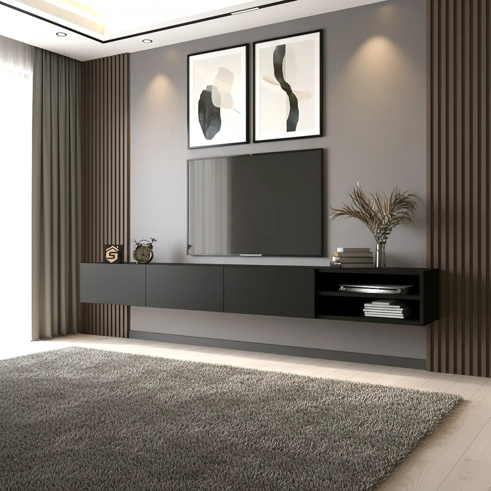 طاولة شاشة معلقة لون أسود، تعتبر هذه الطاولة واحدة ضمن مجموعة طاولات تلفزيون بلازما تصميم تركي مميز وصناعة سعودية ، تم تصنيعها بعناية داخل السعودية، وتم استخدام أجود انواع الخشب التيلندى الذي يتم استخدامه في تصنيع طاولات تلفزيون مميزة وعالية الجودة.
