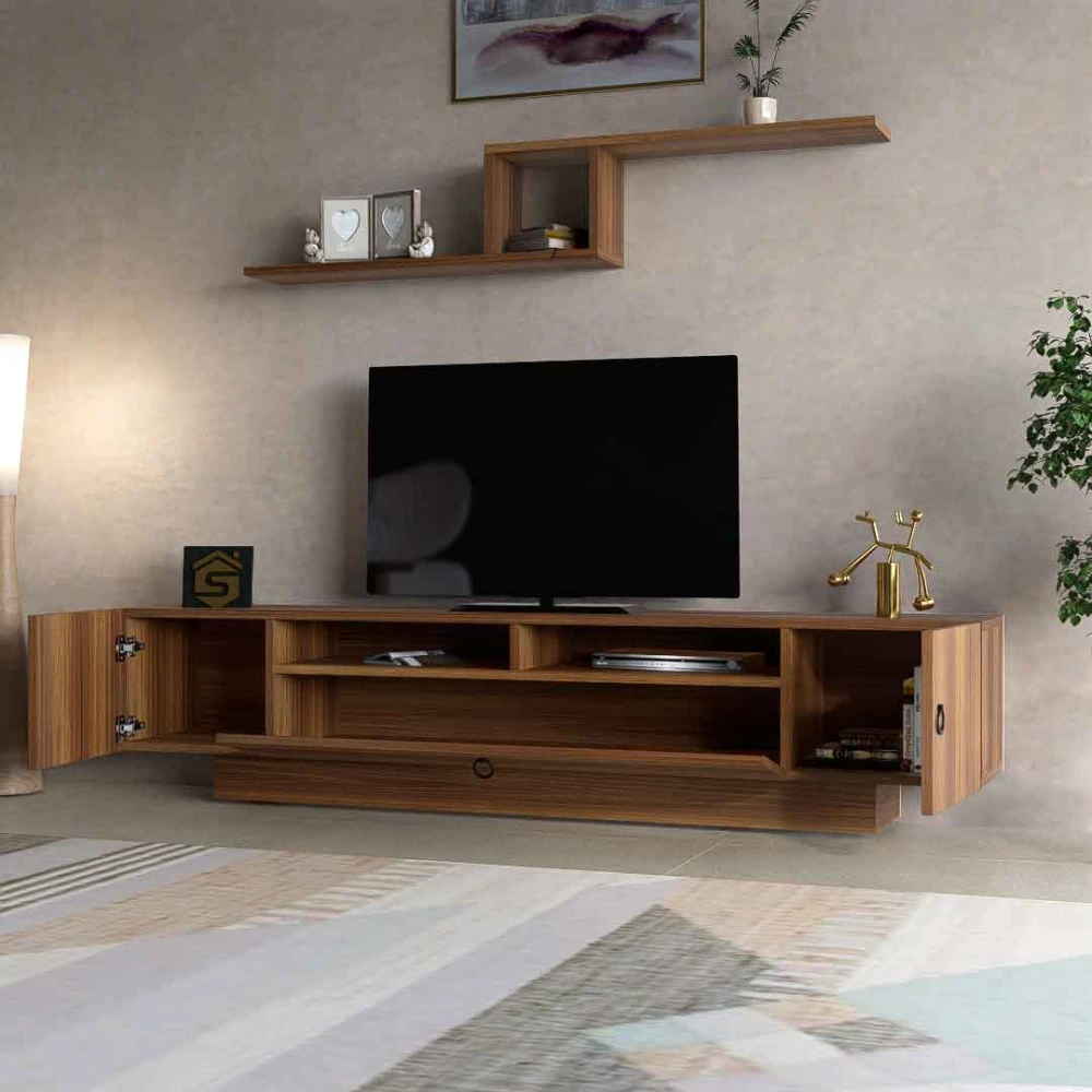 طاولة شاشة مودرن بني، تم تصميم هذه الطاوله باللون البنى الفاتح، بطابع تركى مميز، وتتكون هذه الطاوله من ثلاثه درف، واحده كبيره، واثنتين على الجانبين اصغر، متعدده الاستخدام، ورفين فى المنتصف، تم تصميمهم بطريقة تضمن تمرير الاسلاك الخاصه باجهزه التحكم عن بعد بسهولة، واجهزه الالعاب، ليعطيها استخدام امثل، ورفين متصلين من الوسط بشكل مربع، لتزيين الجدار و اسخدامهم فى اغراض متعدده.