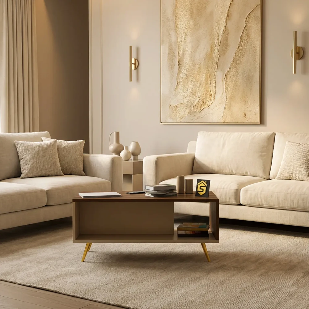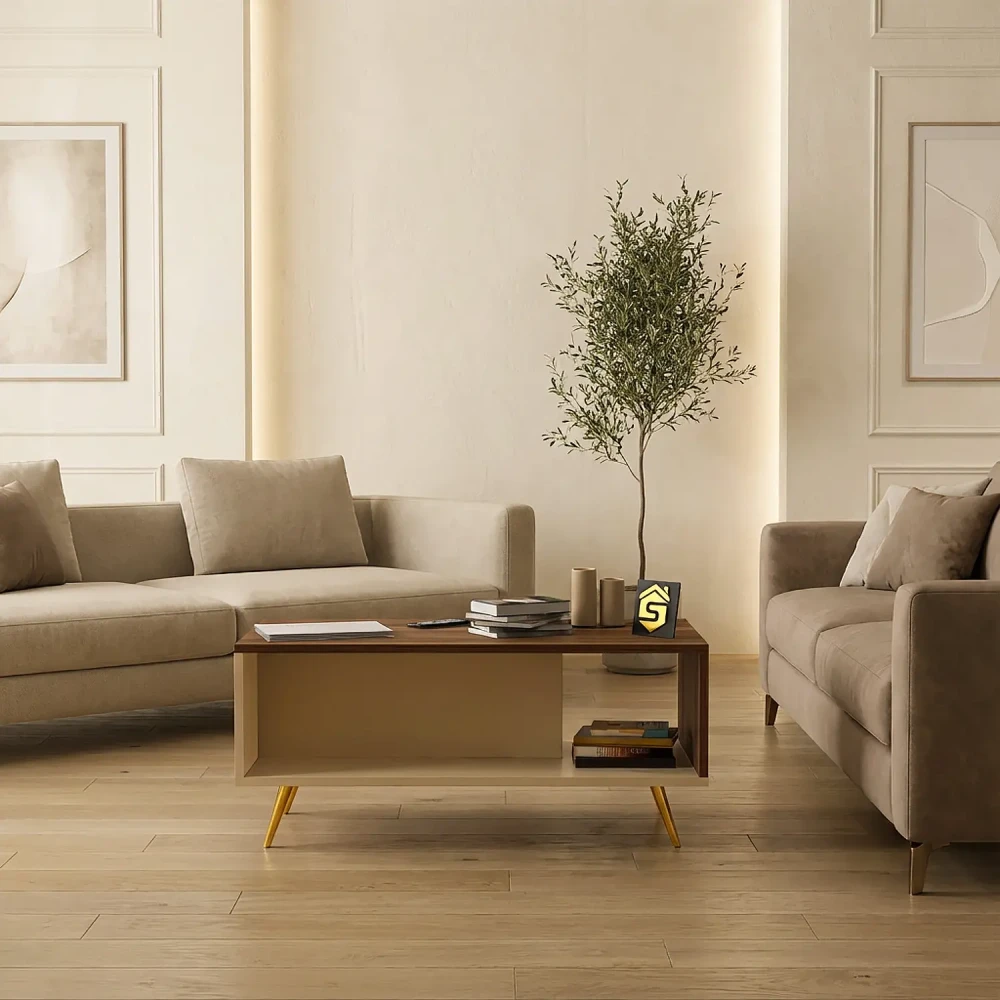 طاولة قهوة لون بيج مع بني، تم تصميم الطاولة على احدث التصاميم العصرية، وهي تحتوي على رف من الاسفل يمكن استخدامة حسب الحاجة، بتصميم تركى عصري حديث.