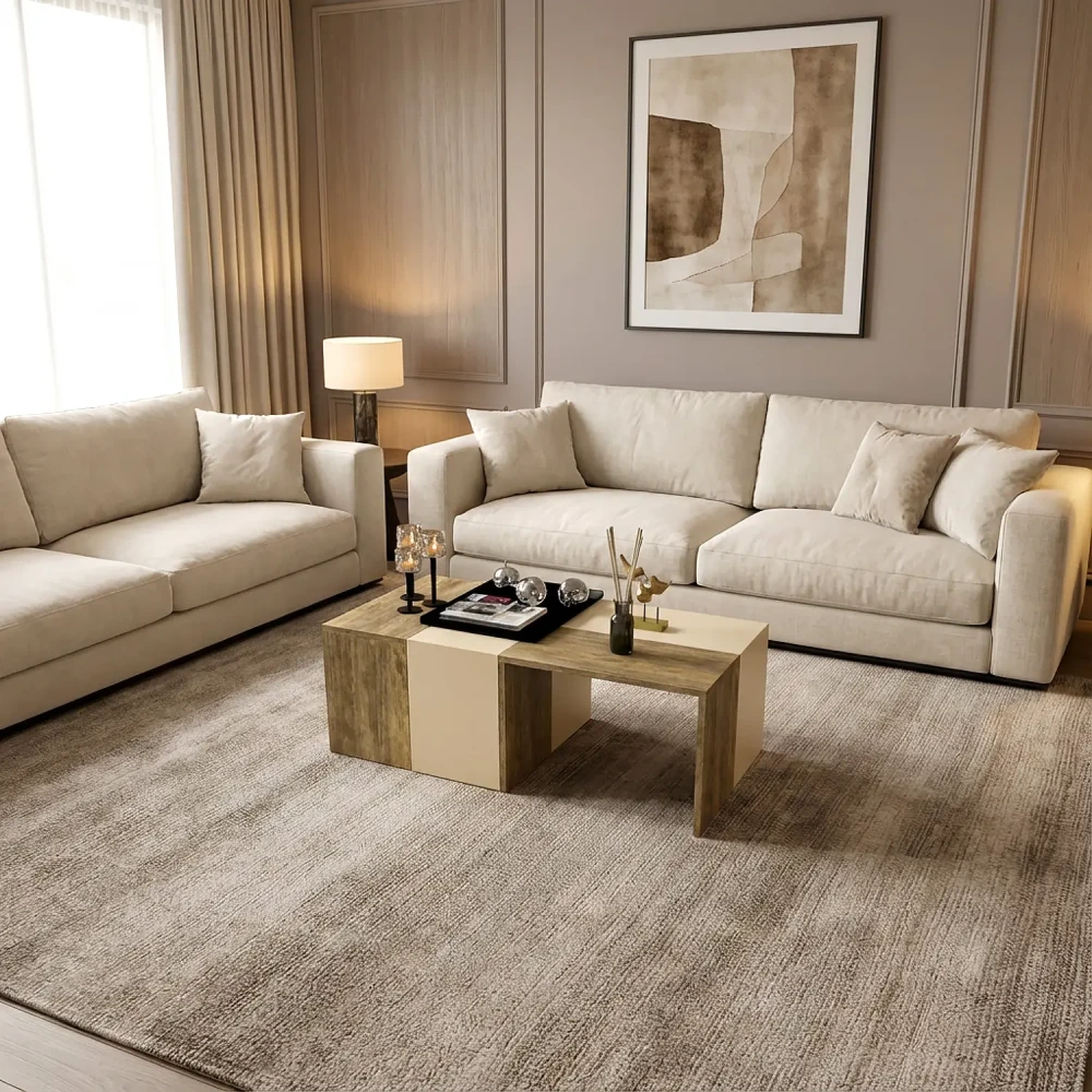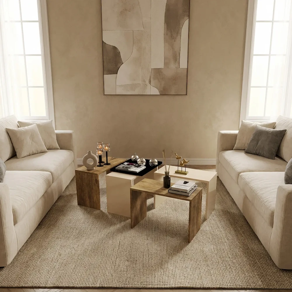 طاولة قهوة 4 قطع بيج مع خشبي، تم تصميم هذه الطاوله بلونين مميزين، وهى طاوله ذكيه، يمكن استخدام كل طاوله على حده، او تجميعهم بشكل جميل، تم التصميم على الطراز التركى.