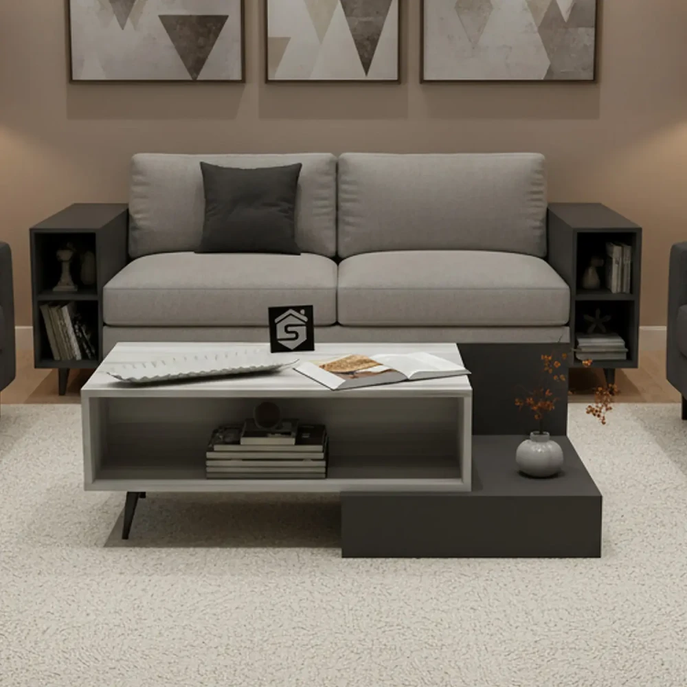 طاولة وسط حديثة رمادي درجتين، طاولة عملية بشكل جمالى وجديد، تحتوي على رف يمكن وضع الكتب بة، ويمكن التحكم بالعرض من 90 سم حتى 130 سم حسب الاحتياج.