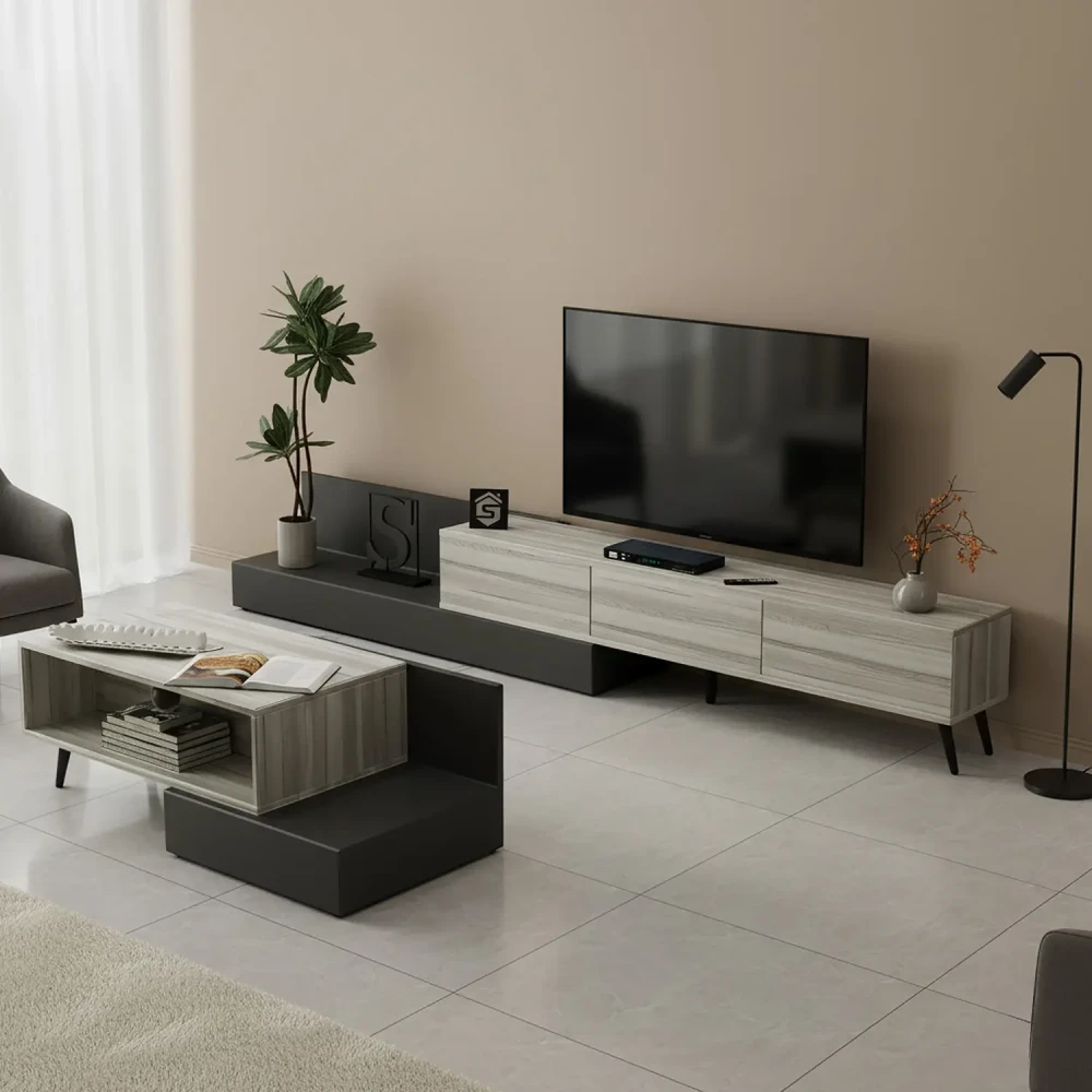طاولة وسط حديثة رمادي درجتين، تعتبر هذة الطاولة ضمن مجموعة طاولات قهوة تصميم تركي مميز وصناعة سعودية، تم تصنيعها بعناية داخل السعودية ، وتم استخدام أجود انواع الخشب التيلندى الذي يتم استخدامه في تصنيع طاولات تلفزيون مميزة وعالية الجودة.