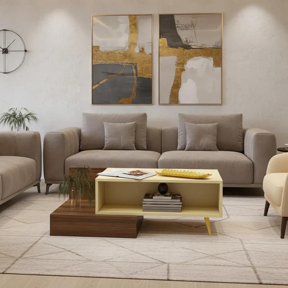 طاولة وسط مودرن بيج مع بني، تعتبر هذة الطاولة ضمن مجموعة طاولات قهوة تصميم تركي مميز وصناعة سعودية، تم تصنيعها بعناية داخل السعودية ، وتم استخدام أجود انواع الخشب التيلندى الذي يتم استخدامه في تصنيع طاولات تلفزيون مميزة وعالية الجودة.