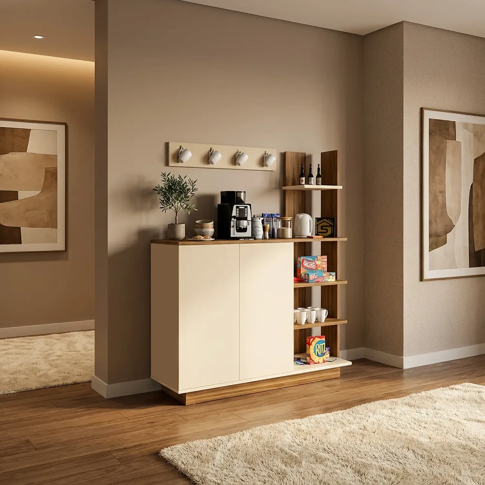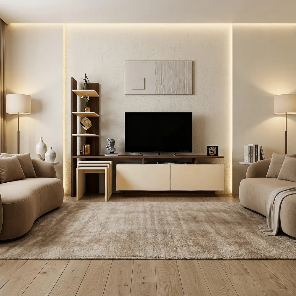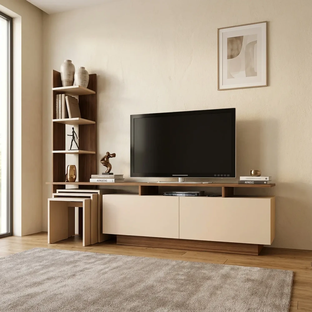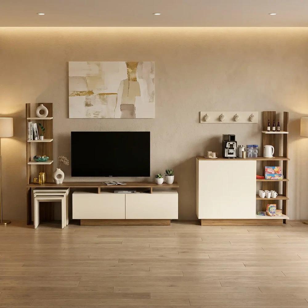 طقم طاولات بيج مع بني، صمم هذا الطقم باللون الابيض، ويتكون هذا الطقم من طاوله تلفزيون، تحتوي علي درفتان، ورف مفتوح لوضع اجهزة الاستقبال، واجهزة الالعاب، وثلاثة أرفف على الجانب الايسر، بألاضافة الي 3 طاولات خدمة، مصمم لها مكان للتخزين بالطاولة، وركن قهوة به اربعة أرفف ودرفتان، وهو مصمم لللاستخدام العملى.