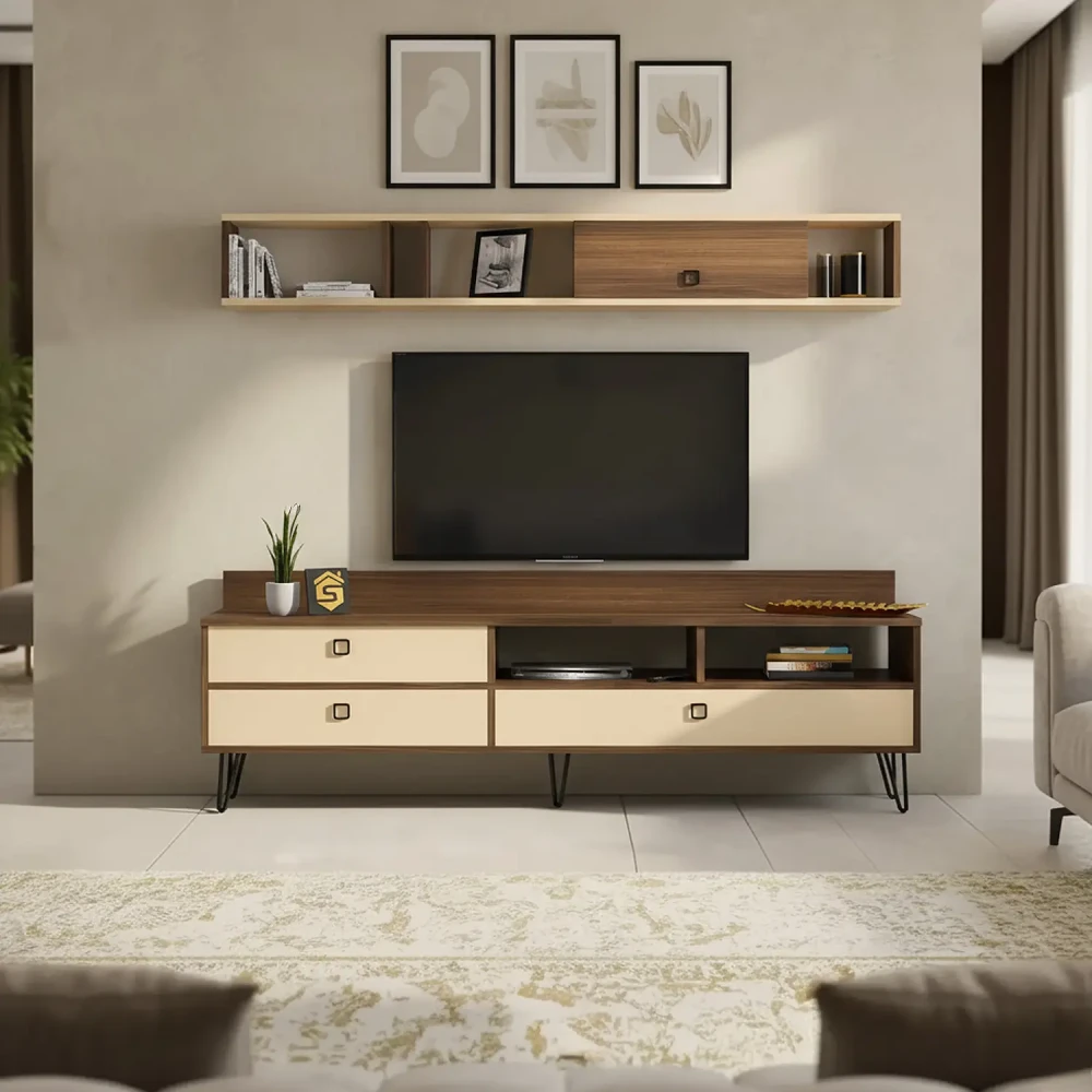 طقم طاولات تلفزيون و قهوة و ركن قهوة، صمم هذا الطقم بلون بيج مع لون بني فاتح، ويتكون هذا الطقم من طاوله تلفزيون، تحتوى على ثلاثة درف ورفين مفتوحين بتصميم مميز، معها وحدة رف بها درفة تعلق على الجدار اعلى الطاولة، وطاوله قهوه بها أربع طاولات خدمه، متعددة الاستخدامات، وركن قهوه به درفة وثلاثة ارفف مفتوحه يمكن استخدامه فى اغراض عديدة، مع رف مزود بحامل للمجات بعرض حوالي 80 سم .