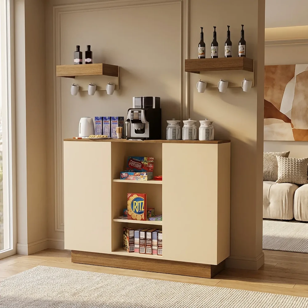 طقم طاولات تلفزيون و قهوة و ركن قهوة، صمم هذا الطقم بلونين من أفضل الالوان المستخدمة في الديكورات المنزلية، ما يعطيها طابع تركى مميز، ويتكون هذا الطقم من طاوله تلفزيون، معها وحدتين ارفف تعلق على الجدار، وطاوله قهوه بتصميم راقي، وركن قهوه ذو استخدامات متعدده، مع رفين خاصين بركن القهوه، مزودين بحامل للمجات وزين هذا الطقم المتكامل بالوان هادئه بطابع تركى حديث.