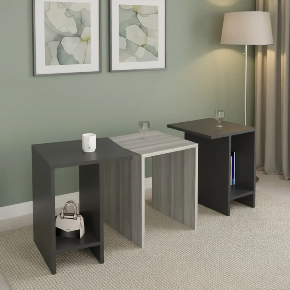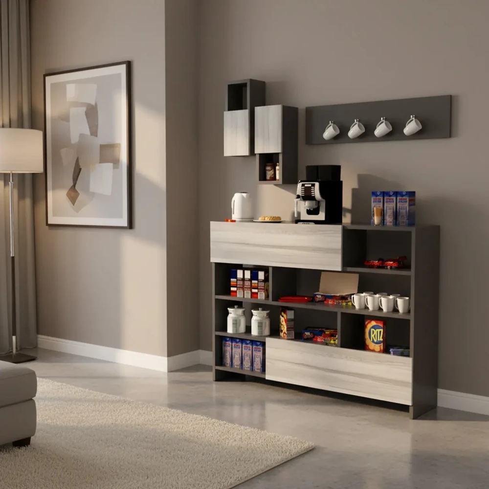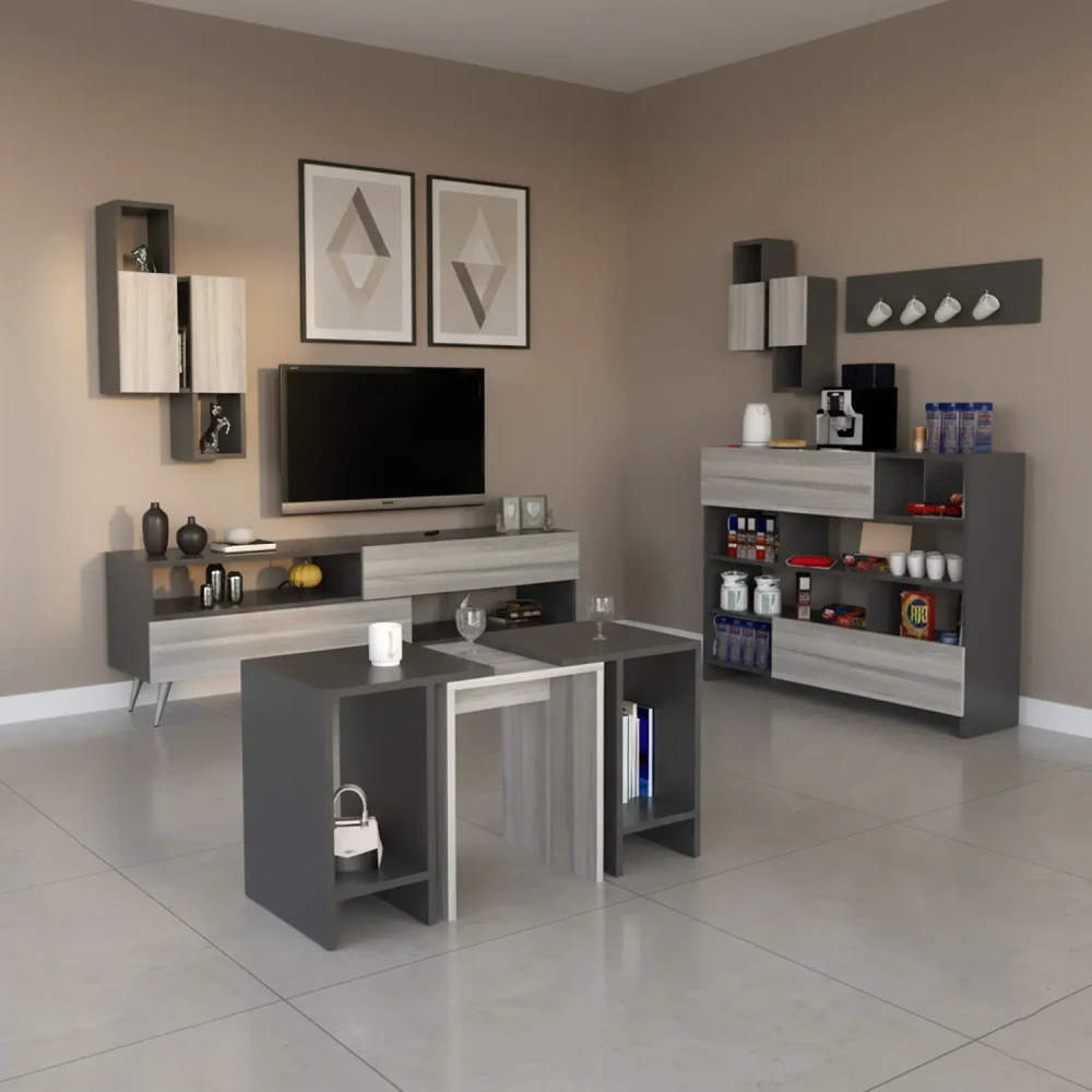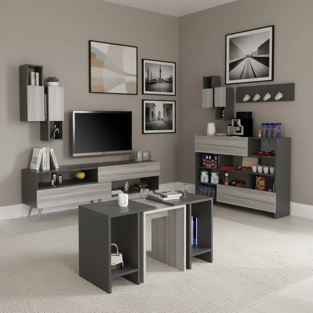 طقم طاولات تلفزيون و قهوة و ركن قهوة، ويتكون هذا الطقم من طاوله تلفزيون، تحتوى على درفتين ورفين مفتوحين بتصميم مميز، معها وحدتان رف بها درفة تعلق على الجدار اعلى الطاولة، وركن قهوة متعدد الاستخدامات يحتوي على درفتان وستة ارفف مفتوحة ويمكن استخدام سطح الركن لوضع ماكينة تحضير القهوة، وطاولة وسط تنقسم لثلاث طاولات لتحقيق الاستفادة وتوفير المساحة.