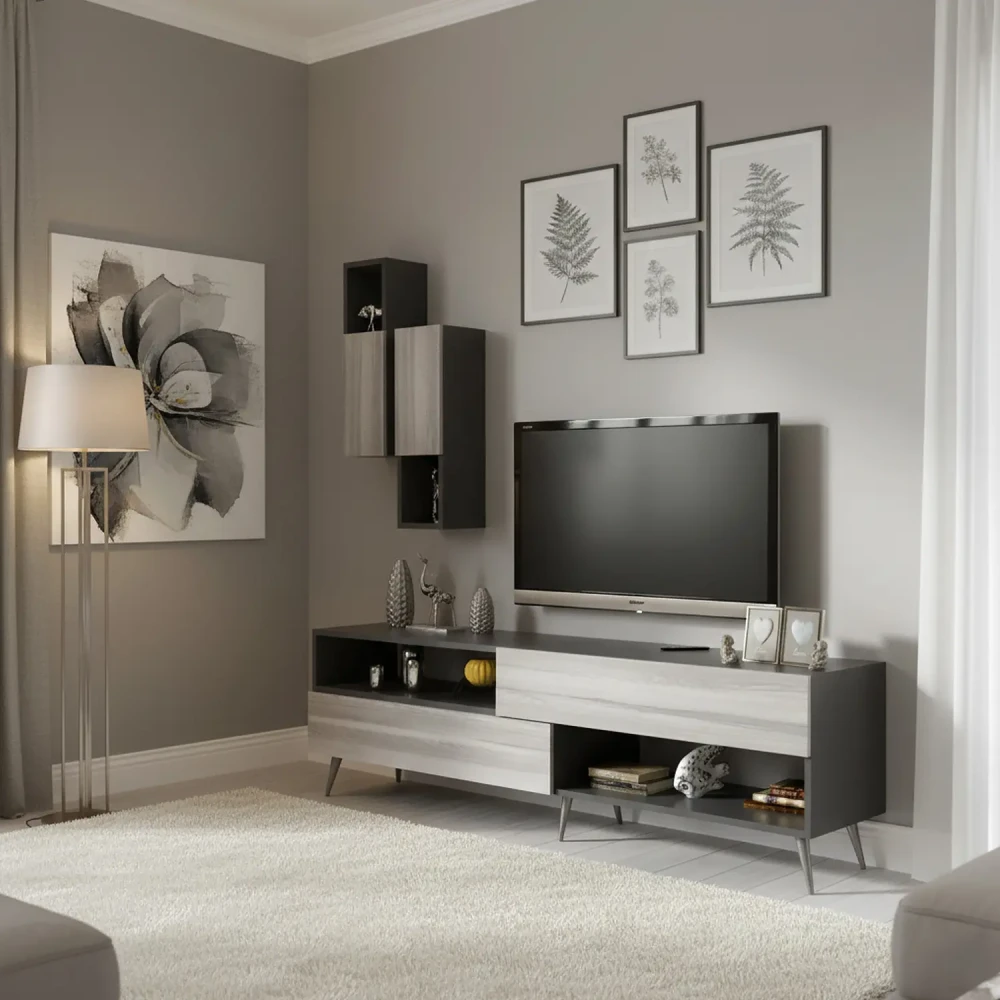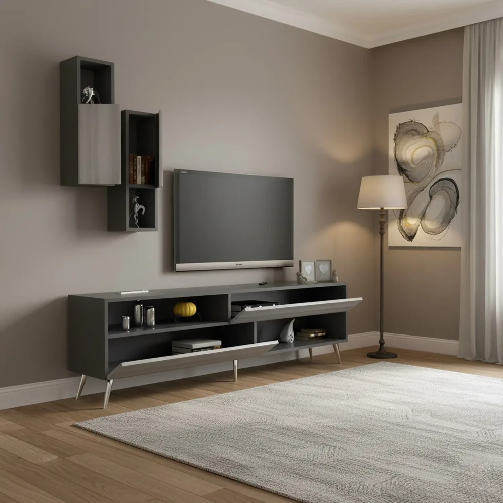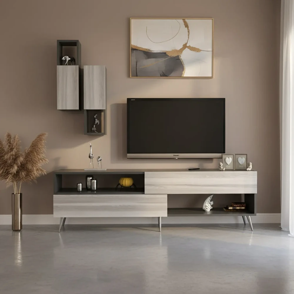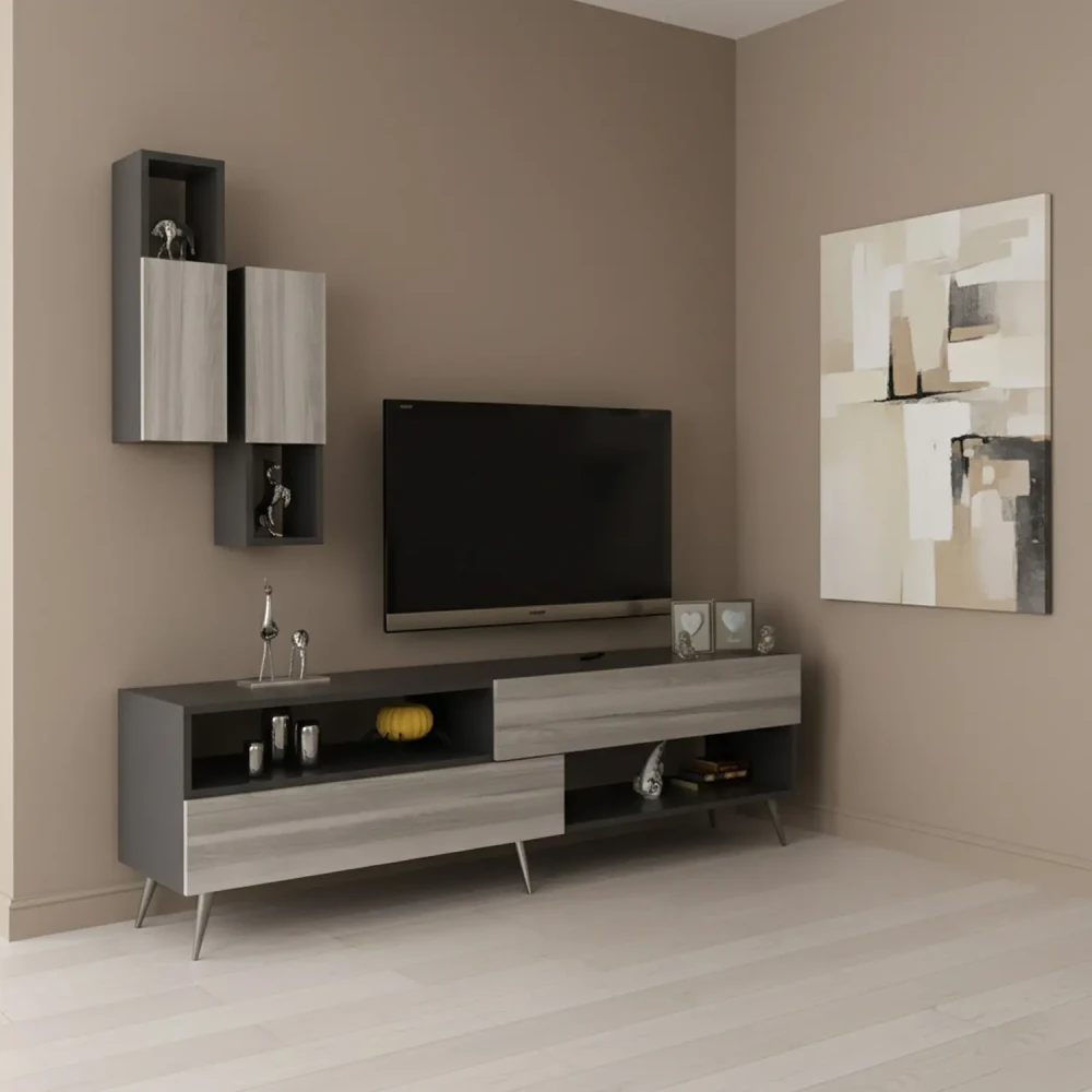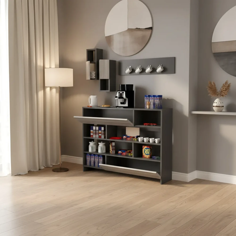 طقم طاولات تلفزيون و قهوة و ركن قهوة، ويتكون هذا الطقم من طاوله تلفزيون، تحتوى على درفتين ورفين مفتوحين بتصميم مميز، معها وحدتان رف بها درفة تعلق على الجدار اعلى الطاولة، وركن قهوة متعدد الاستخدامات يحتوي على درفتان وستة ارفف مفتوحة ويمكن استخدام سطح الركن لوضع ماكينة تحضير القهوة، وطاولة وسط تنقسم لثلاث طاولات لتحقيق الاستفادة وتوفير المساحة.