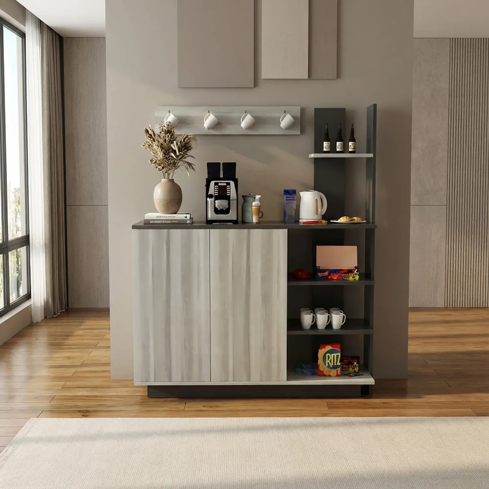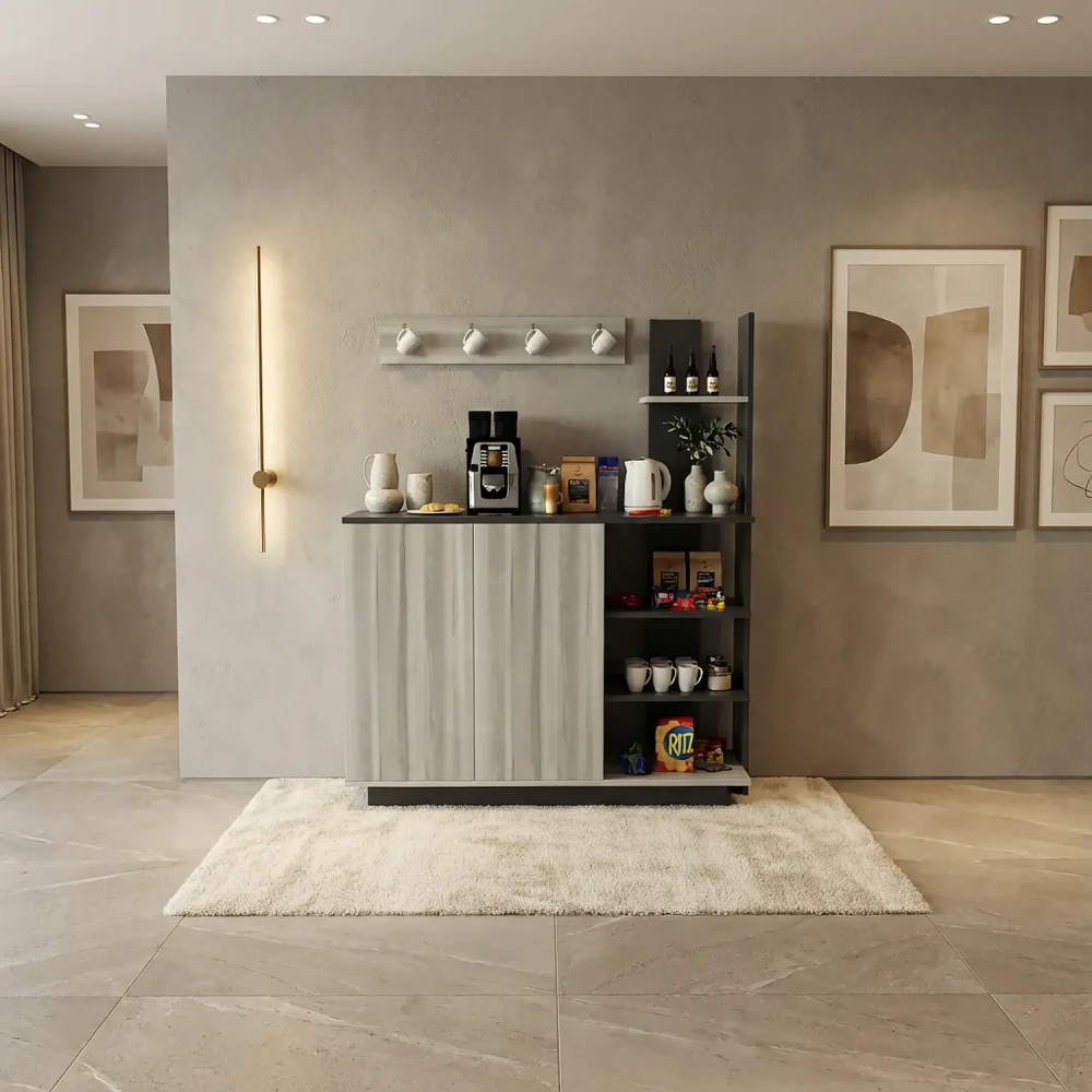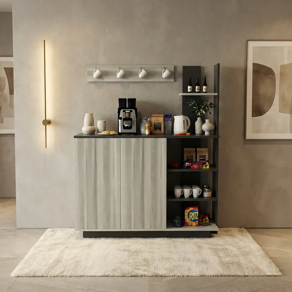 طقم طاولات لون رمادي درجتين، ويتكون هذا الطقم من طاوله تلفزيون، تحتوي علي درفتان، ورف مفتوح لوضع اجهزة الاستقبال، واجهزة الالعاب، وثلاثة أرفف على الجانب الايسر، بألاضافة الي 3 طاولات خدمة، مصمم لها مكان للتخزين بالطاولة، وركن قهوة به اربعة أرفف ودرفتان، وهو مصمم لللاستخدام العملى.