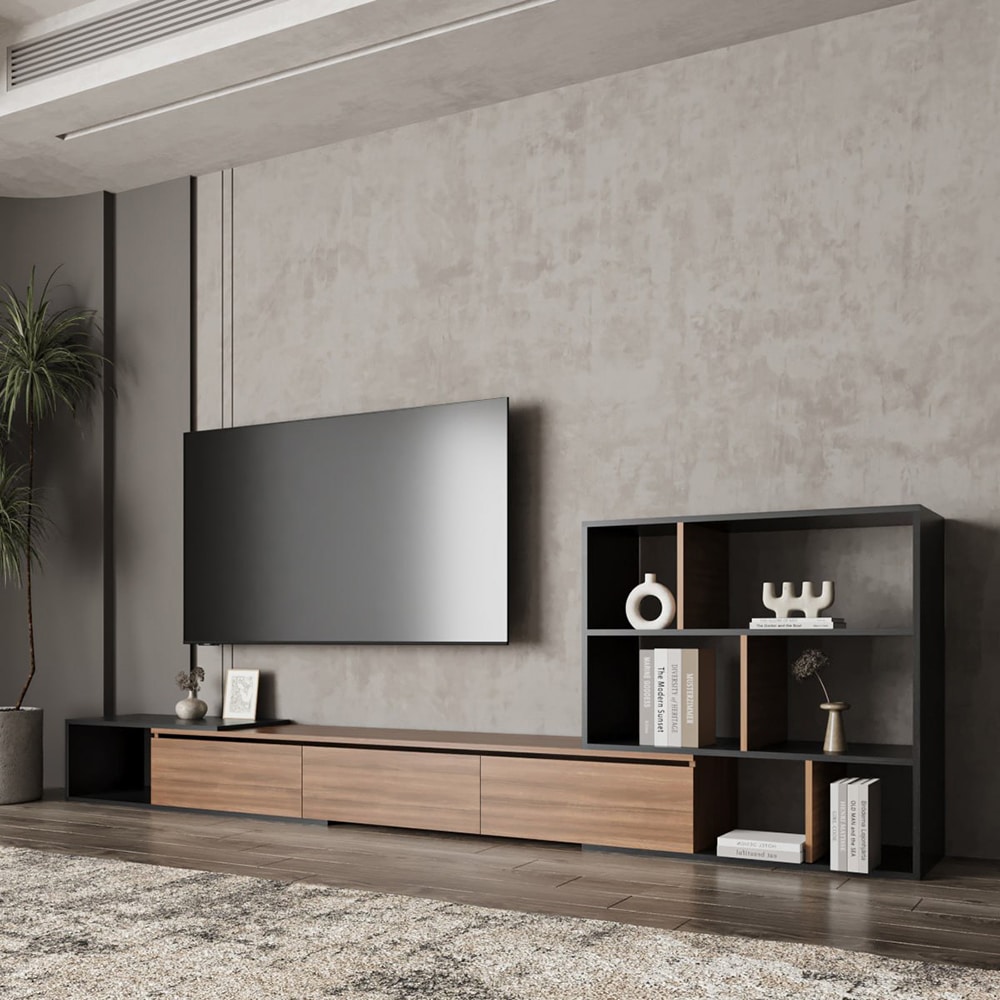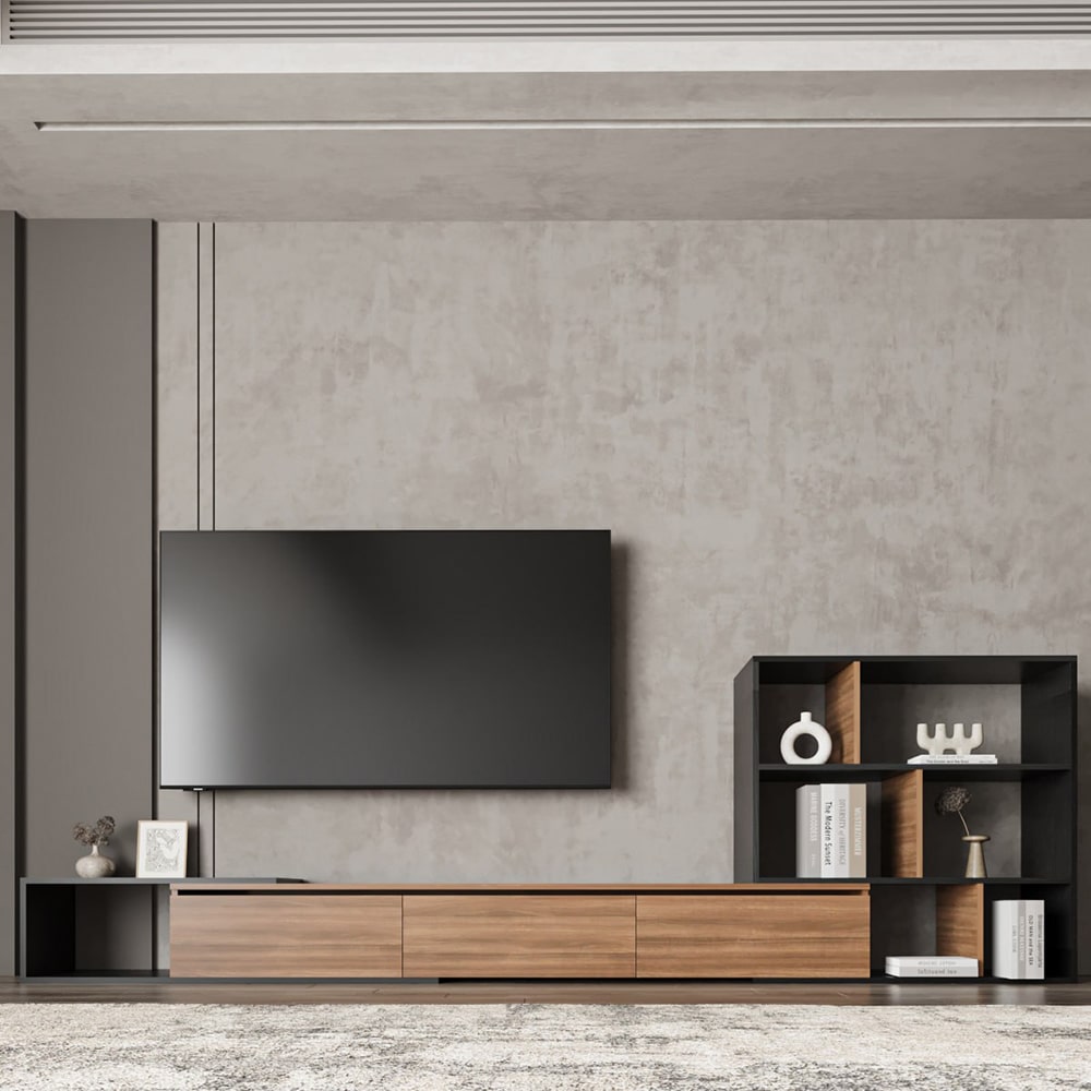 مكتبة تلفزيون برفوف باللونين البني والأسود تضفي لمسة من الأناقة والفخامة على غرفة المعيشة. تتميز هذه المكتبة بتصميمها العملي والجمالي الذي يجمع بين الأرفف الجانبية، الأدراج، والرف الجانبي، مما يوفر لك مساحة واسعة لتخزين وتنظيم مختلف الأدوات والأجهزة الإلكترونية بشكل مرتب ومنظم.