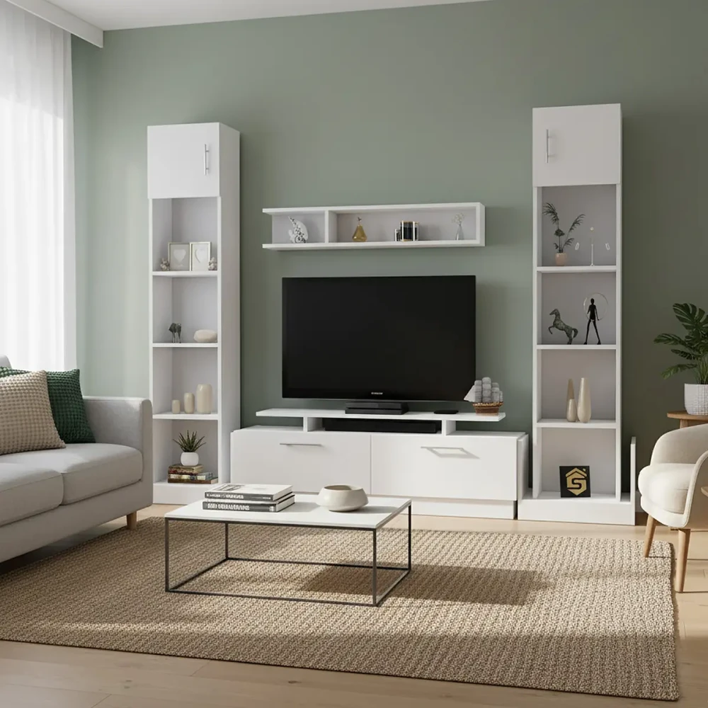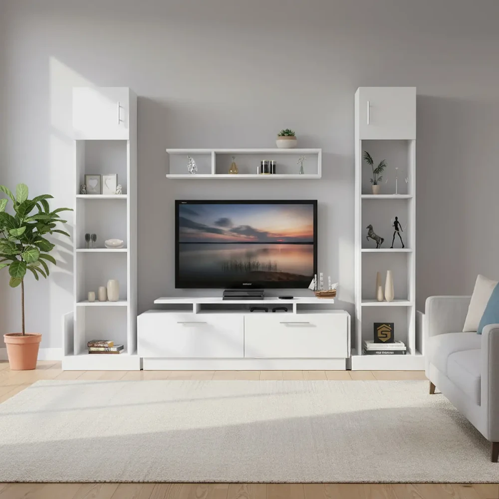 مكتبة تلفزيون كبيرة لون أبيض، مع رفوف فخر الصناعة السعودية بتصميم تركي عالية الجودة، صنعت في المملكة العربية السعودية.