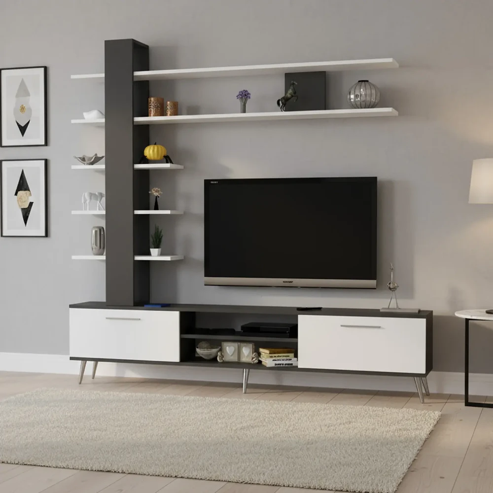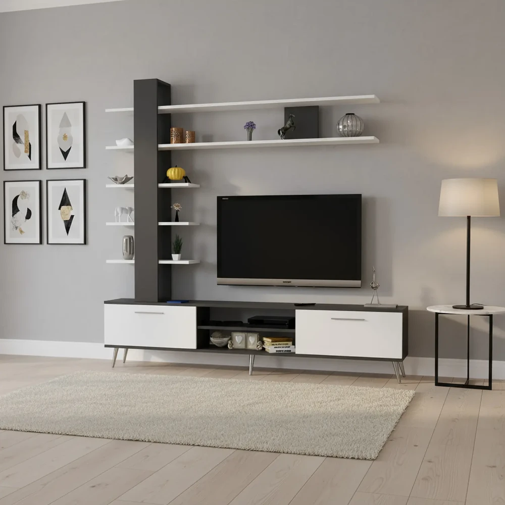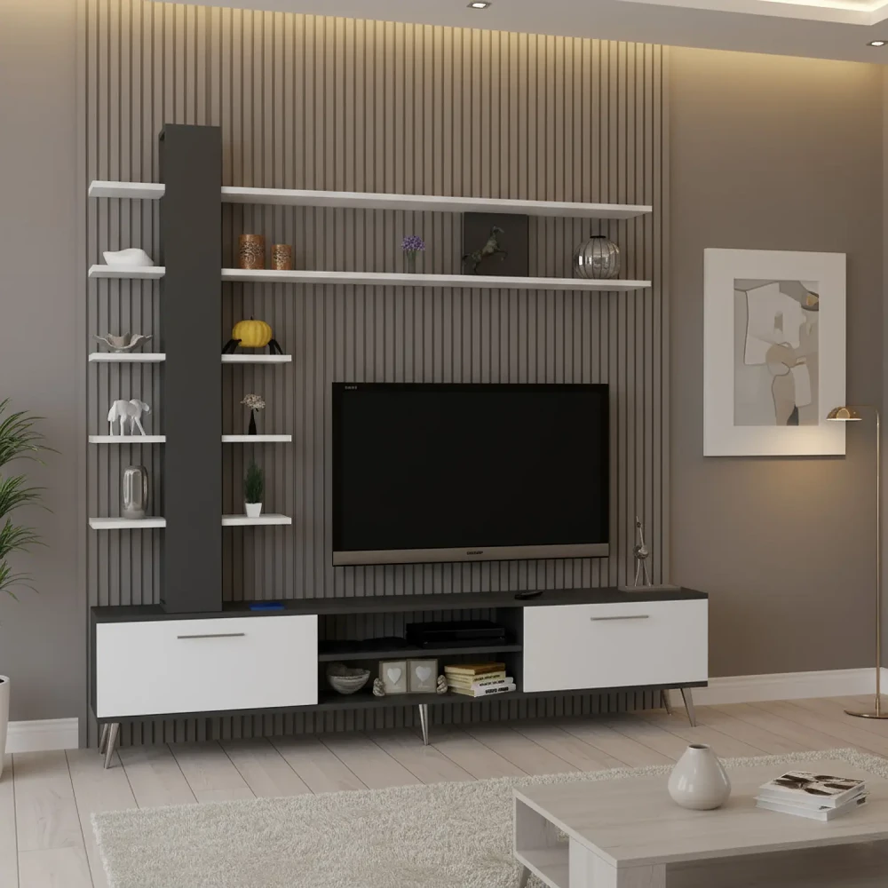 تتكون الطاولة من درفتان، ورفين بداخلها، ويمكن استخدام سطحها كرف كبير، ويمكن وضع اجهزه التحكم عن بعد اعلاها، او بأحد الارفف الداخلىه، بالاضافه الى وحده أرفف طويله تحتوى على ثلاثه ارفف عرضعها حوالي 60 سم ورفين عرضهم 180 سم، ليكتمل التصميم يمكن وضع التحف او الكتب فيها.