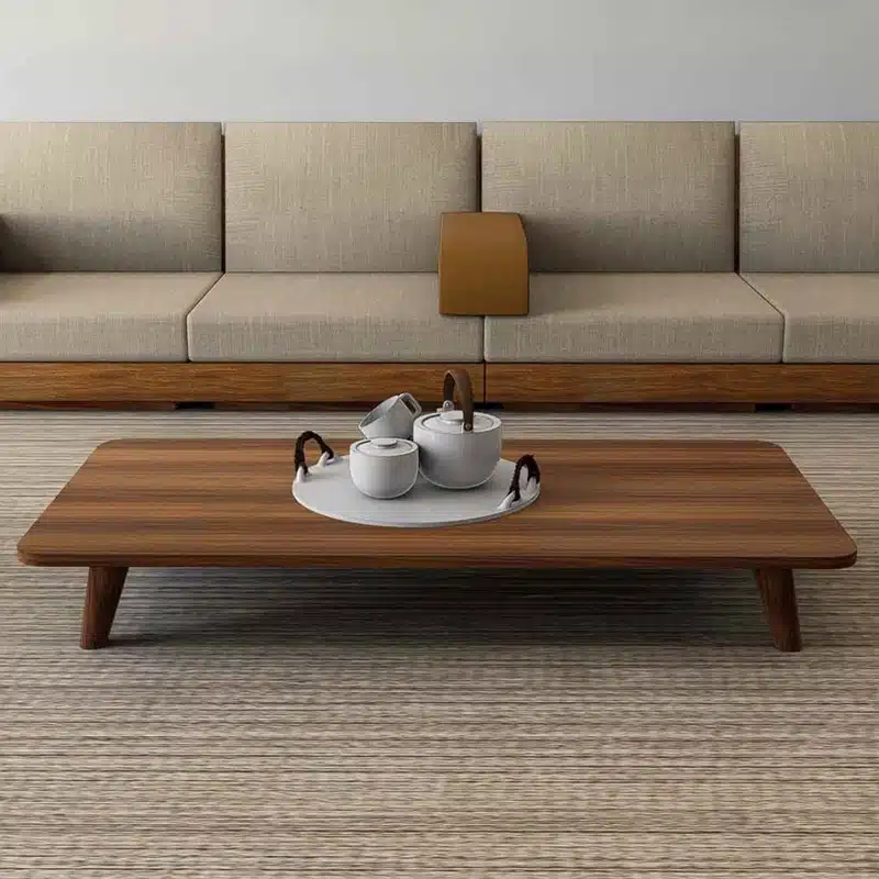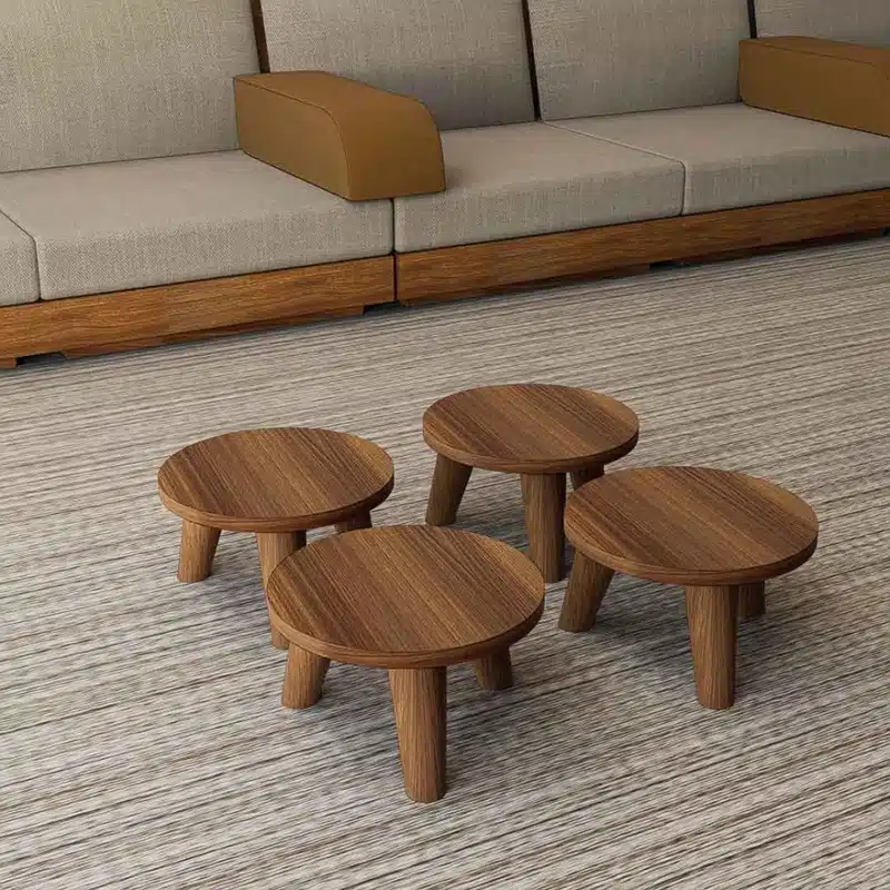 4 طاولات خدمة مجلس عربي لون بني، متعددة الاستخدامات بأرتفاع منخفض يناسب المجالس الارضية التقليدية، لتقديم المشروبات والضيافة، مصنعة من أجود أنواع الخشب التيلندي الممتاز الملبس ميلامين عالى المقاومة وبأرجل معدنية متينة.